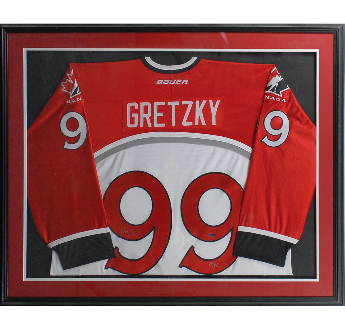 Limited edition official Bauer replica Team Canada hockey jersey, numbered 27/99, with sewn on letters and numbers, signed in silver ink on the number on the back. Impressively double-matted and framed to an overall size of 42 x 34. In fine condition, with an Upper Deck authentication label affixed to the number. Accompanied by a certificate of authenticity from Upper Deck. Oversized.