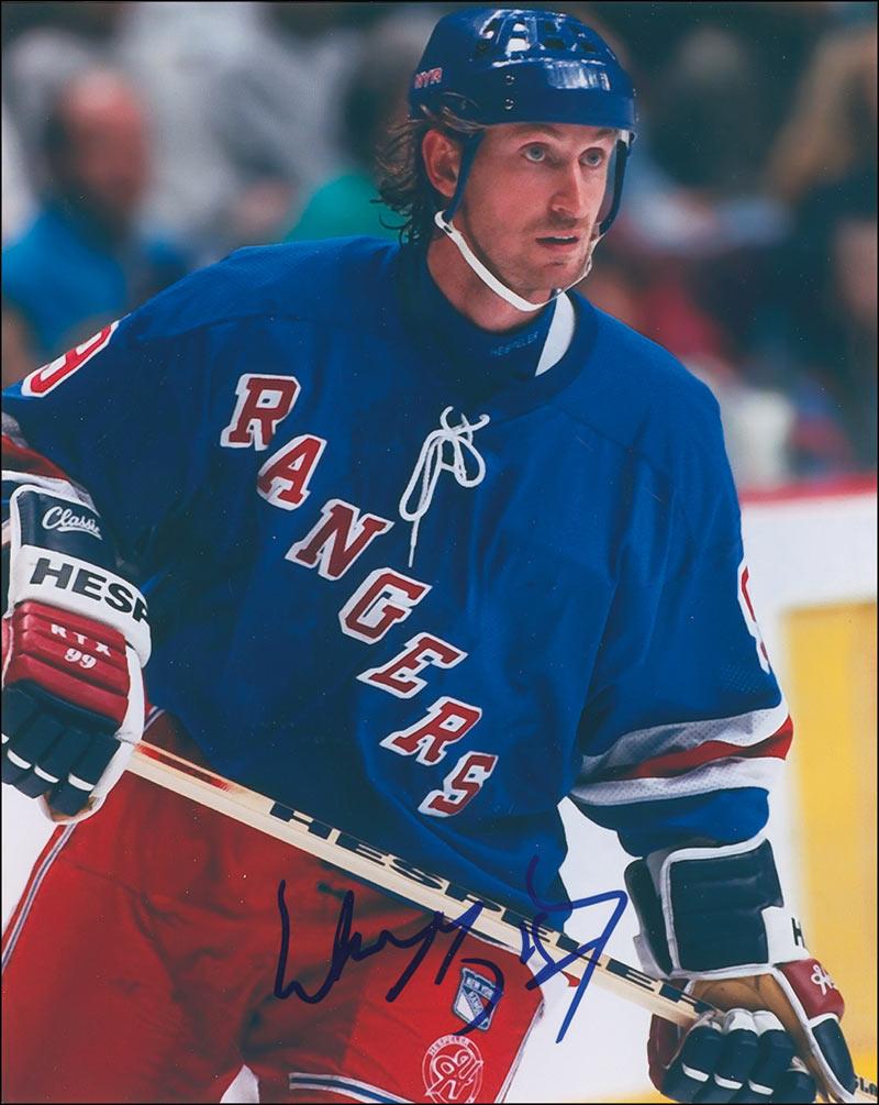 Color glossy 8 x 10 photo of Gretzky on the ice in his Rangers uniform, signed in-person in blue felt tip. In very fine condition.