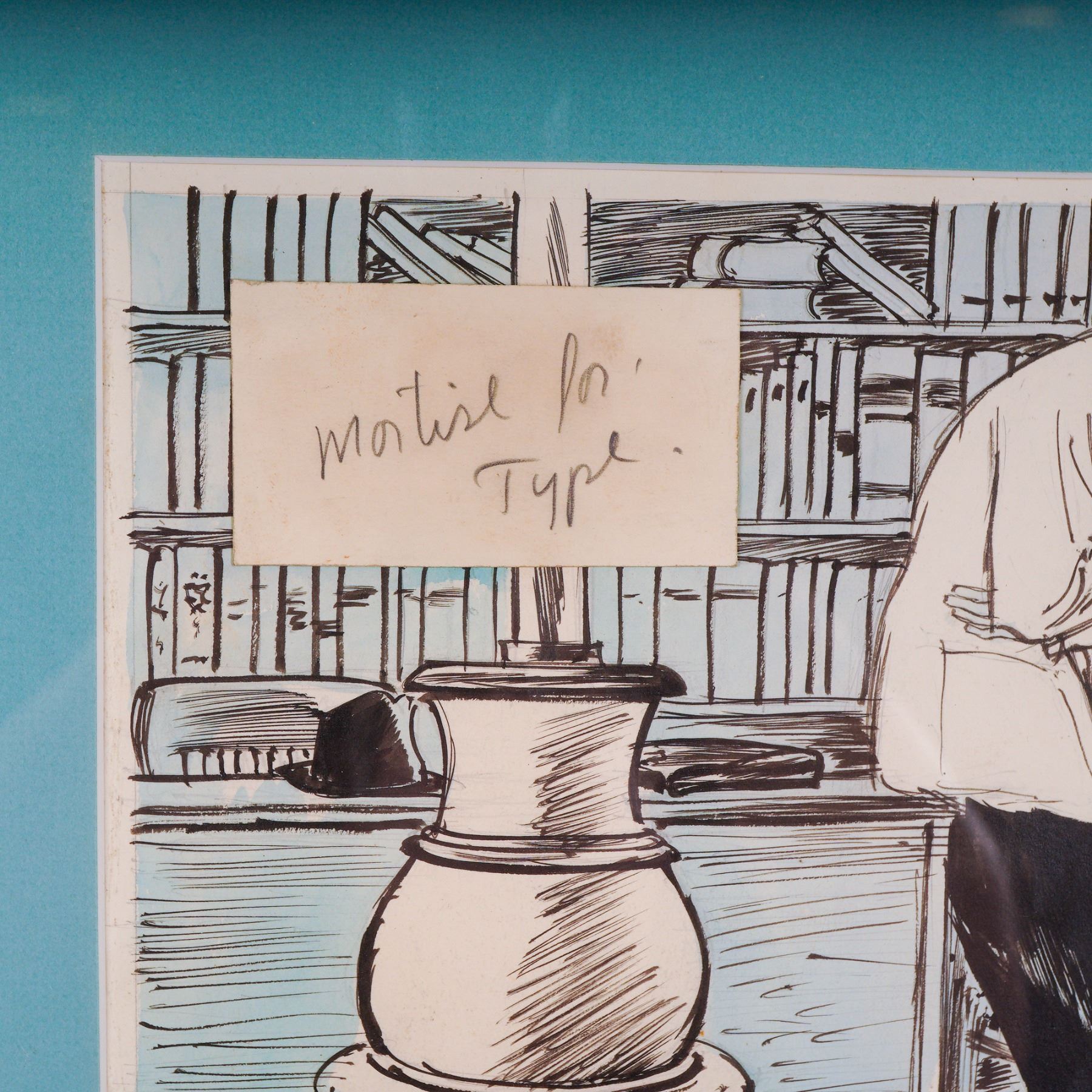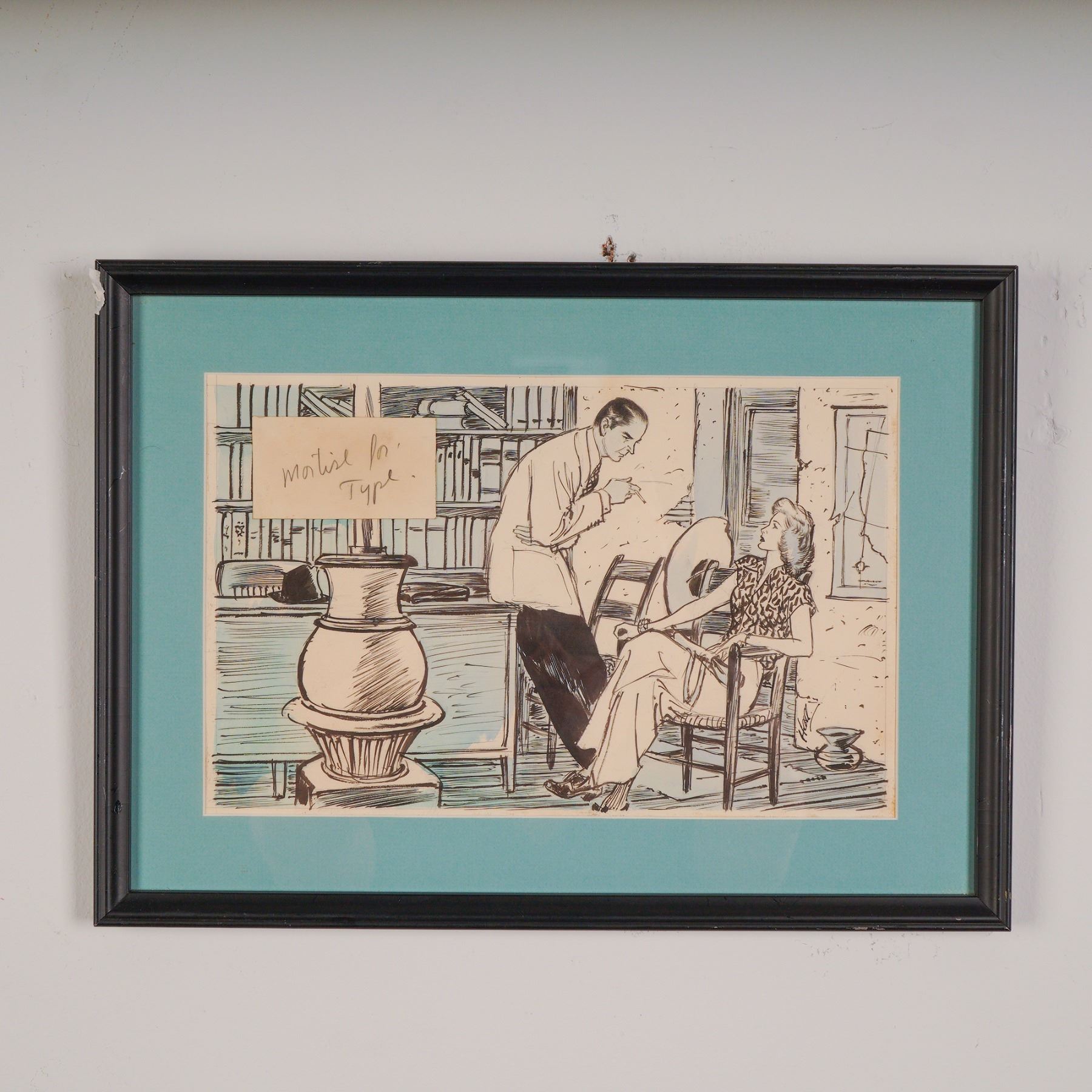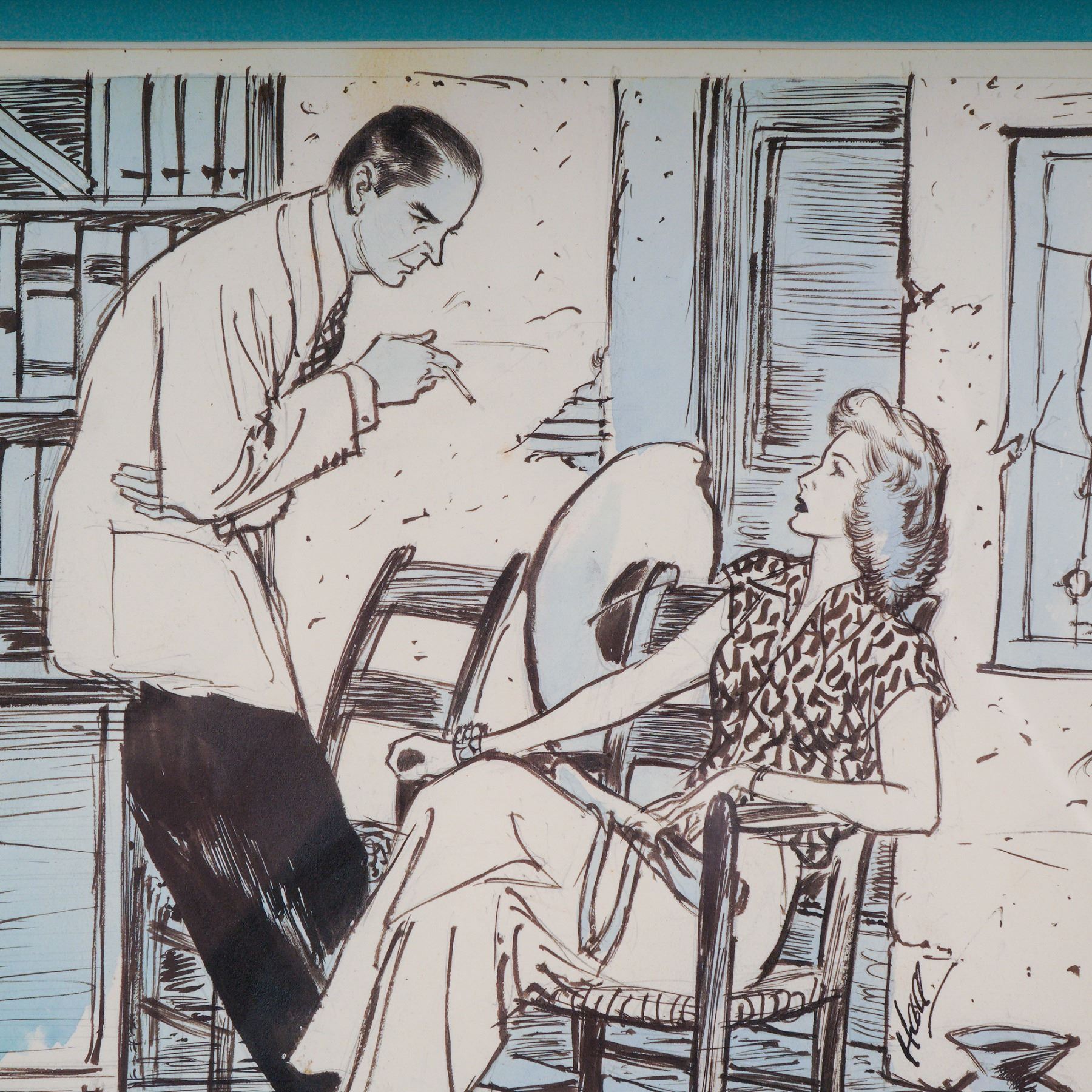 A striking original pen-and-ink illustration created for the July 16, 1944 publication of The Hidden Town, a serialized story by Frederick R. Bechdolt. This drawing, likely used for the second installment (as noted on the reverse), features a stylish mid-century interior with a dramatic scene between a man and woman. The man leans toward the seated woman, who rests a sun hat on her lap, exuding a blend of mystery and domestic tension. The illustration is signed HALL in ink at the lower right. A handwritten note on the back includes a publication date, the installment number, and a caption: "Tell me how much you remember of the days when you were a little girl here" (Page 31). A pasted label on the drawing reads "mortise for type," indicating space reserved for the printed caption. Framed under glass with a pale green mat and black wooden frame.