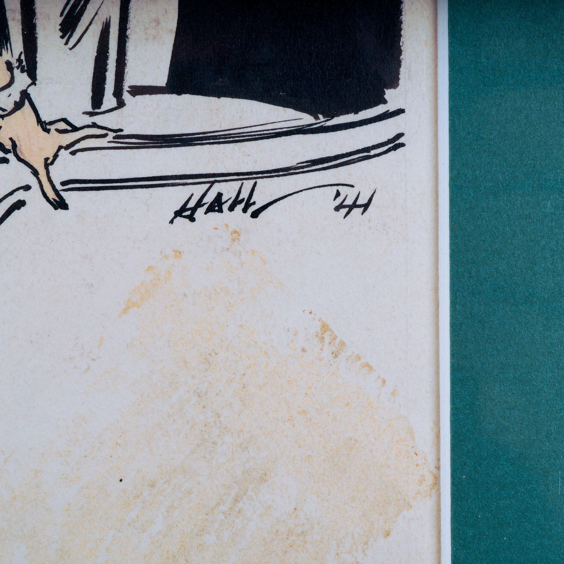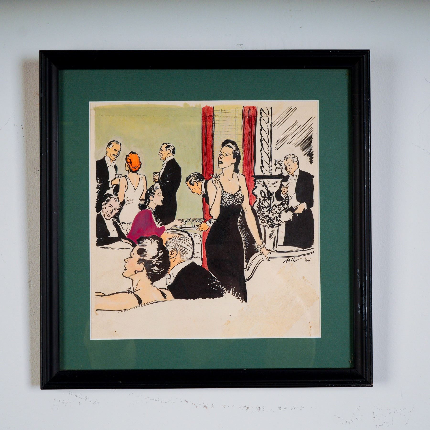 Wayne Hall Illustration in Ink & Wash, Elegant Cocktail Party Scene, Signed