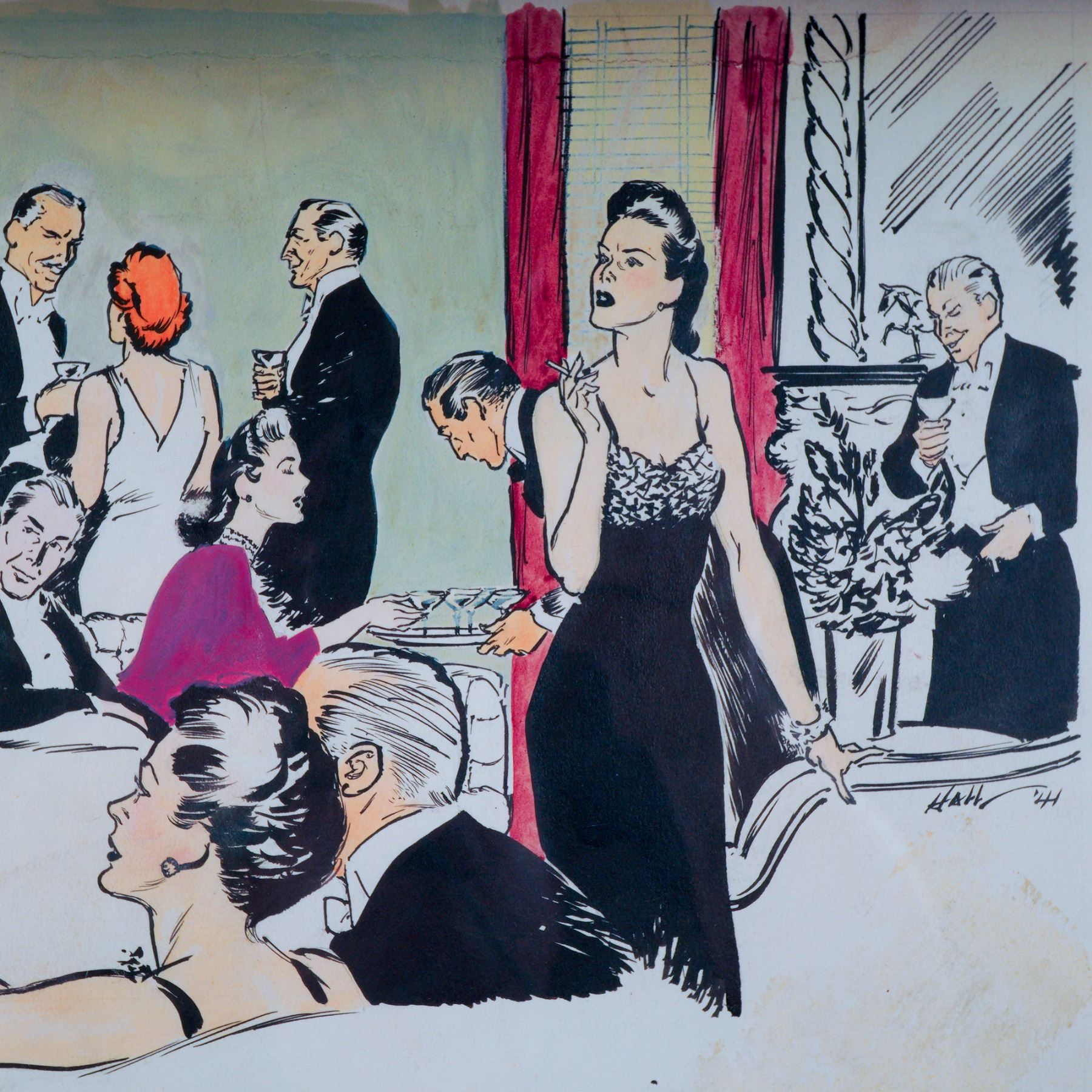 Original ink and wash illustration by artist Wayne Hall, depicting a sophisticated evening party scene, likely produced for editorial or magazine use. The composition features a glamorous woman in a black gown holding a cigarette, surrounded by sharply dressed guests in tuxedos and cocktail attire, set against bold red drapes and a mirrored fireplace. The artwork is signed Hall and dated 44 at lower right. Executed with confident lines and selective use of color, the piece captures the polished visual style of 1940s commercial illustration. Framed under glass with green matting.
