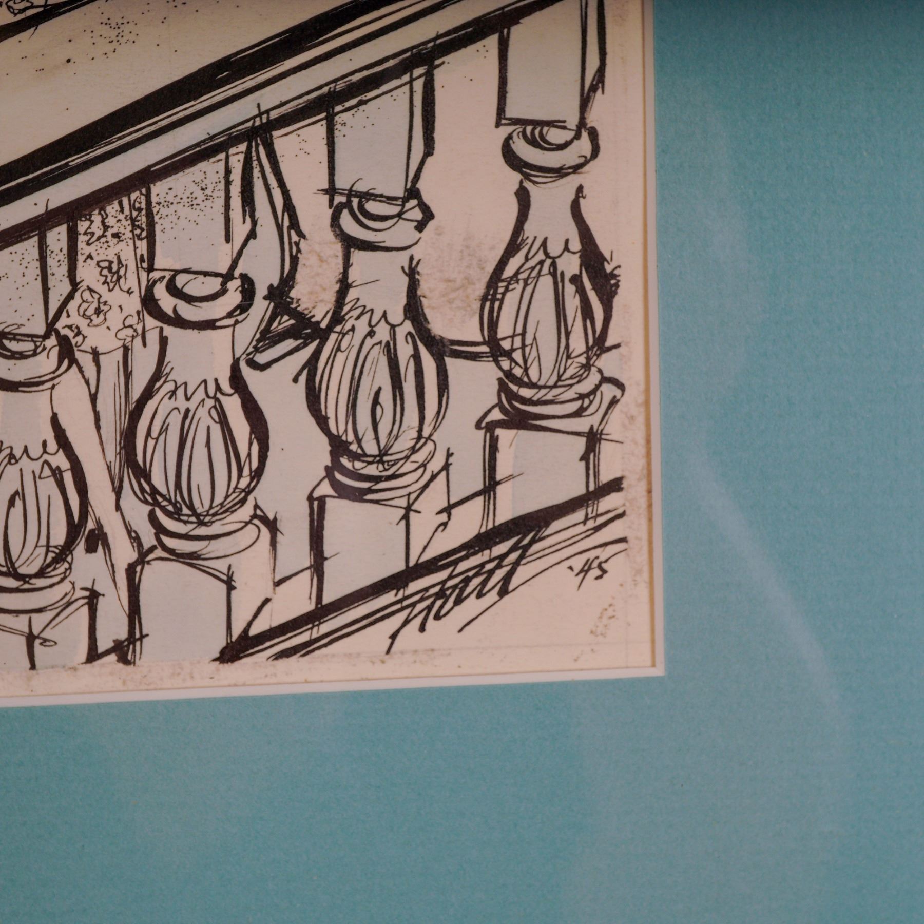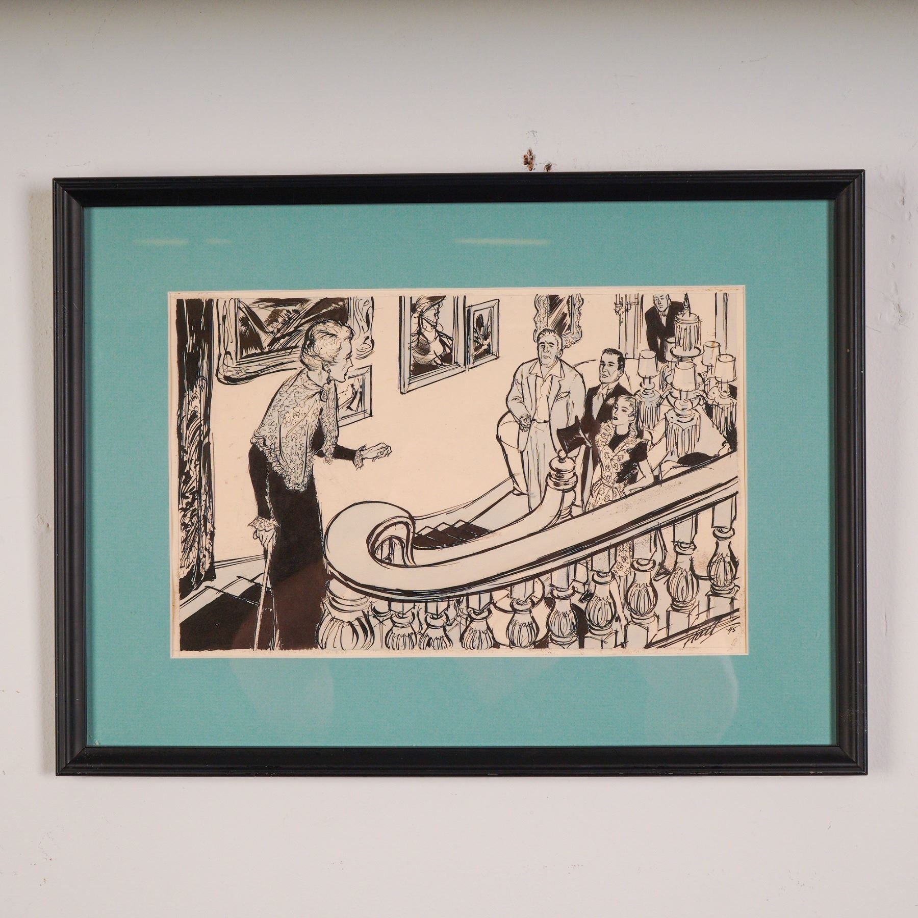 An original ink illustration by Wayne Hall, created for the story Unlovingly Yours by Frank Adams, published May 13, 1945. This piece served as the visual accompaniment to the third installment of the serialized fiction, likely featured in a mid-20th-century American magazine. Rendered in striking black ink with subtle tonal washes, the composition captures a dramatically lit interior scene: a woman descends a grand staircase while a cluster of well-dressed figures - including two men and another elegantly attired woman -look on from below. A waiter or butler lurks just behind an elaborate display of tiered lamps, adding to the layered narrative tension of the scene. Hall's confident, linear style and strong use of contrast contribute to a cinematic atmosphere, typical of wartime pulp and romance illustration. A handwritten note affixed to the reverse of the frame provides key publication details and a quotation: "I am sure, Trueman, that you will be able to take care of this affair with as little commotion as possible..." (Page 45). Signed "Hall '45" in ink lower right. Framed and matted in archival materials.