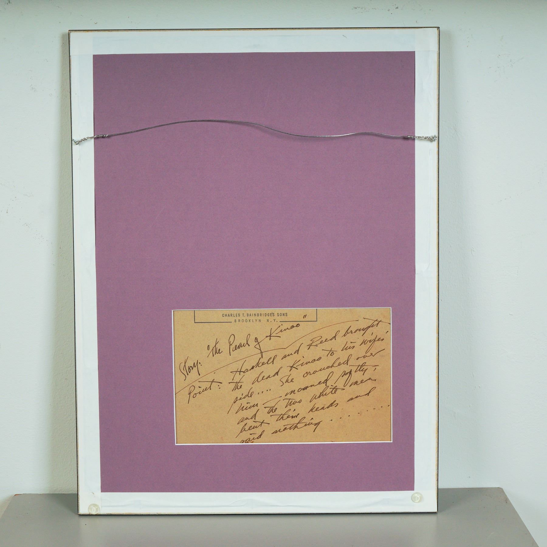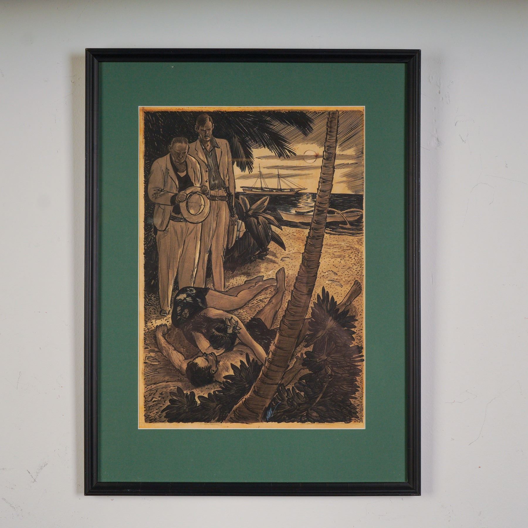 Evocative original ink illustration by artist Wayne Hall, created for the story titled "The Pearl of Kinoo", likely produced for mid-century pulp or adventure fiction publication. The tropical beach scene captures a dramatic moment: two men in white suits stand in silence as a woman grieves over the body of a fallen man, framed by thick foliage and a ship at anchor in the distance. A handwritten production card on the reverse quotes the story's narration: "Haskell and Reed brought the dead Kinoo to his wife's side¦ she crouched over him¦ moaned softly¦ the two white men bent their heads and said nothing¦" The artwork is signed Hall in the lower middle. Presented under glass in a black frame with green matting.