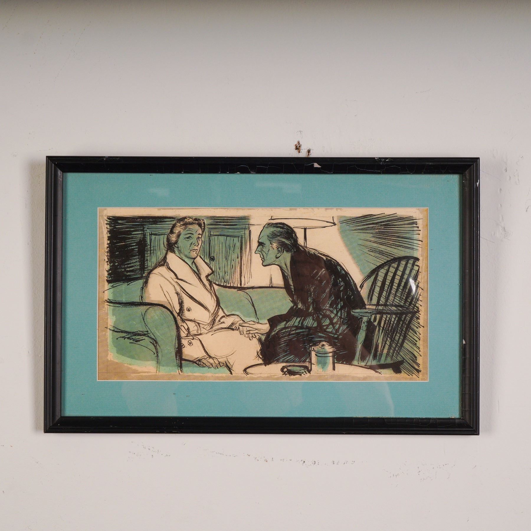 A vintage pen and ink illustration by Hall, executed for the story The Golden Totem by Barnett Willoughby, published December 10, 1944 as the tenth installment of its serialized appearance. This dramatic mid-century drawing depicts an intense conversation between two figures seated on a couch, the composition tightly framed to convey emotional intimacy and suspense. Strong linear hatching and subtle greenish-blue shading accentuate the interior space, evoking a noir-like atmosphere consistent with 1940s period illustration. Though unsigned on the visible surface, the artwork is part of a cohesive series attributed to Hall, with verso documentation noting publication details and narrative context: "Now, now, dear lady, calm yourself," Greer's voice soothed (Page 290). Presented in a simple black frame with archival matting.