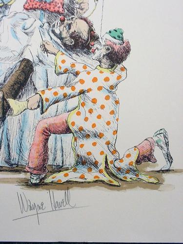 This rather dark humor clown art caricature of the medical profession is by noted clown artist Wayne Howell: * * Title: "The Interns" * Lithography on Arches-like paper * Hand signed in pencil by the artist LR * Numbered in pencil LL * Title in pencil Center * Sheet size: 20 × 26 * Slight corner and edge creasing readily matted out; colors bright and fresh * Certificate of Authenticity from Midwest Estate Buyers * A great gift for the medical student — priced to sell!