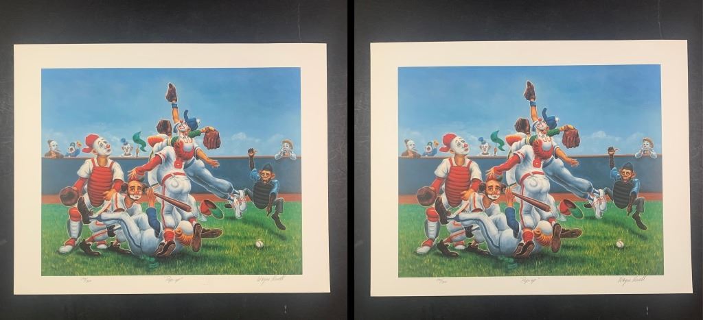 Wayne Howell's "Pop-up" limited edition prints, signed lower right and numbered 292/350 and 293/350. These are of clowns playing baseball, with a monkey umpire. Both pieces are in near excellent condition with extremely minor to very minor creases at corners.