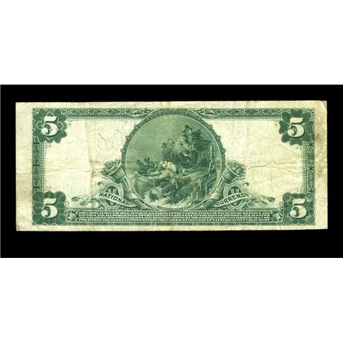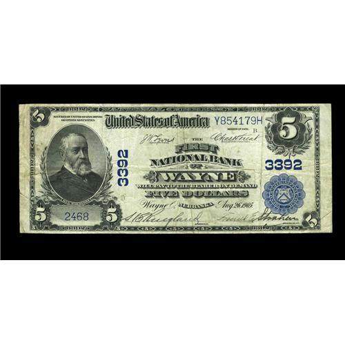<B>Wayne, NE</B></I> - $5 1902 Plain Back Fr. 599 <B>The First NB</B></I> Ch. # 3392<BR>While relatively common in small size, this bank is quite scarce in large, with just four such examples recorded in the Kelly census. Pleasing <B>Fine-Very Fine,</B></I> with pen signatures.