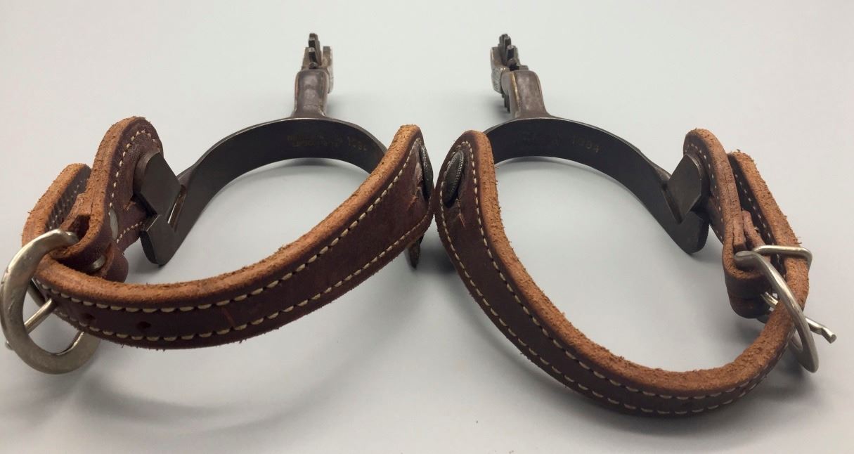 Maker: Marked, Wayne Paul, Lipscomb, TX (# 1094). Approx. Age: Contemporary. Size: 3 1/4” heel opening. 3/4” wide heel bands. 3” long shanks including the rowels. Condition: Like new. Additional Info: A pair of double mounted, iron spurs with lady leg designs. Comes with spur leathers. Please look closely at the pictures - they are an important part of our description. Shipping: There will be a $5 handling / packaging fee for shipping this lot. The actual cost of postage will be added on top of that.