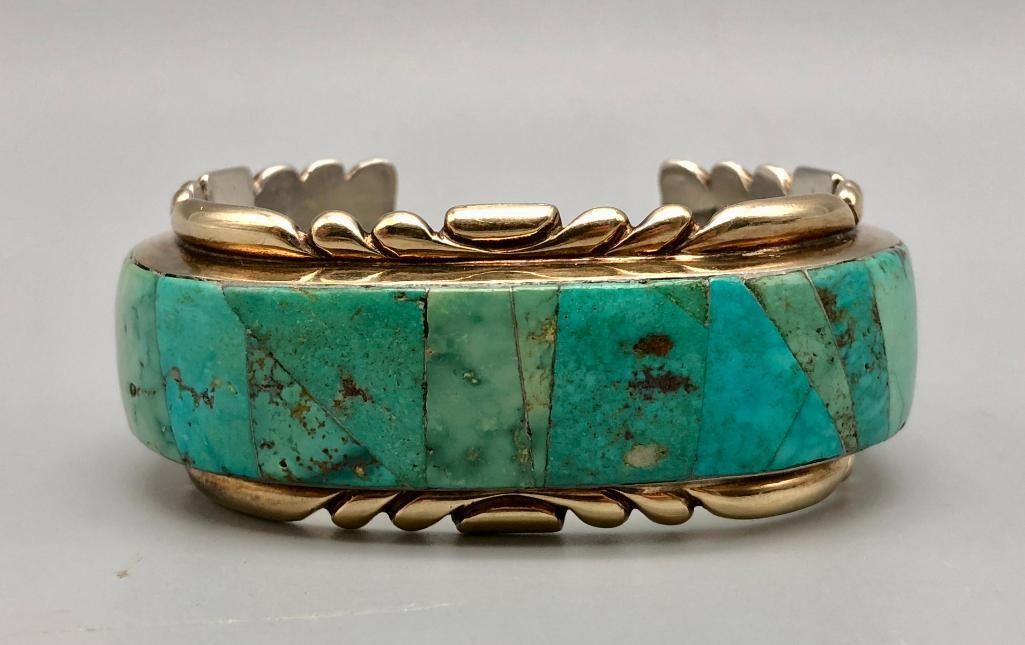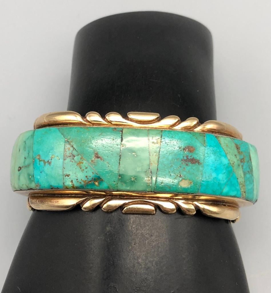 Offered for sale in this lot is a Wayne Quam 14k over silver bracelet. This is a fantastic inlay bracelet that has nice, flush blue/green turquoise. It features raised settings with scalloped file work in the edges. It is stamped 14k overlay. MAKER: Hallmarked W & V Quam. Wayne Quam (Zuni). APPROX AGE: Fairly Modern. SIZE: Inside circumference measures 5-3/8 inches long. Opening is an additional 1 inch, fitting a 6-3/8 inch wrist. Width is 1-1/8 inches. Weighs 69.6 grams. CONDITION: Good for its age, normal wear expected. Please look closely at the pictures as they are an important part of our description and are hereby incorporated into the description, specifically with regards to condition. SHIPPING: There will be a $5 handling / packaging fee for shipping this lot. The actual cost of postage will be added on top of that. BUY IT NOW: If you would like to buy this item now, without waiting for the auction day to bid on it, we do offer this option (which is available up to 48 hours before the actual auction starts). The “Buy it Now†price is the high estimate of this lot (plus applicable fees and the Buyer's premium is discounted to 10% when using the Buy it Now option). If you would like to exercise this option, you must contact us by email (or phone as long as you talk to someone live). Reference this lot number and your intention to "Buy it Now."