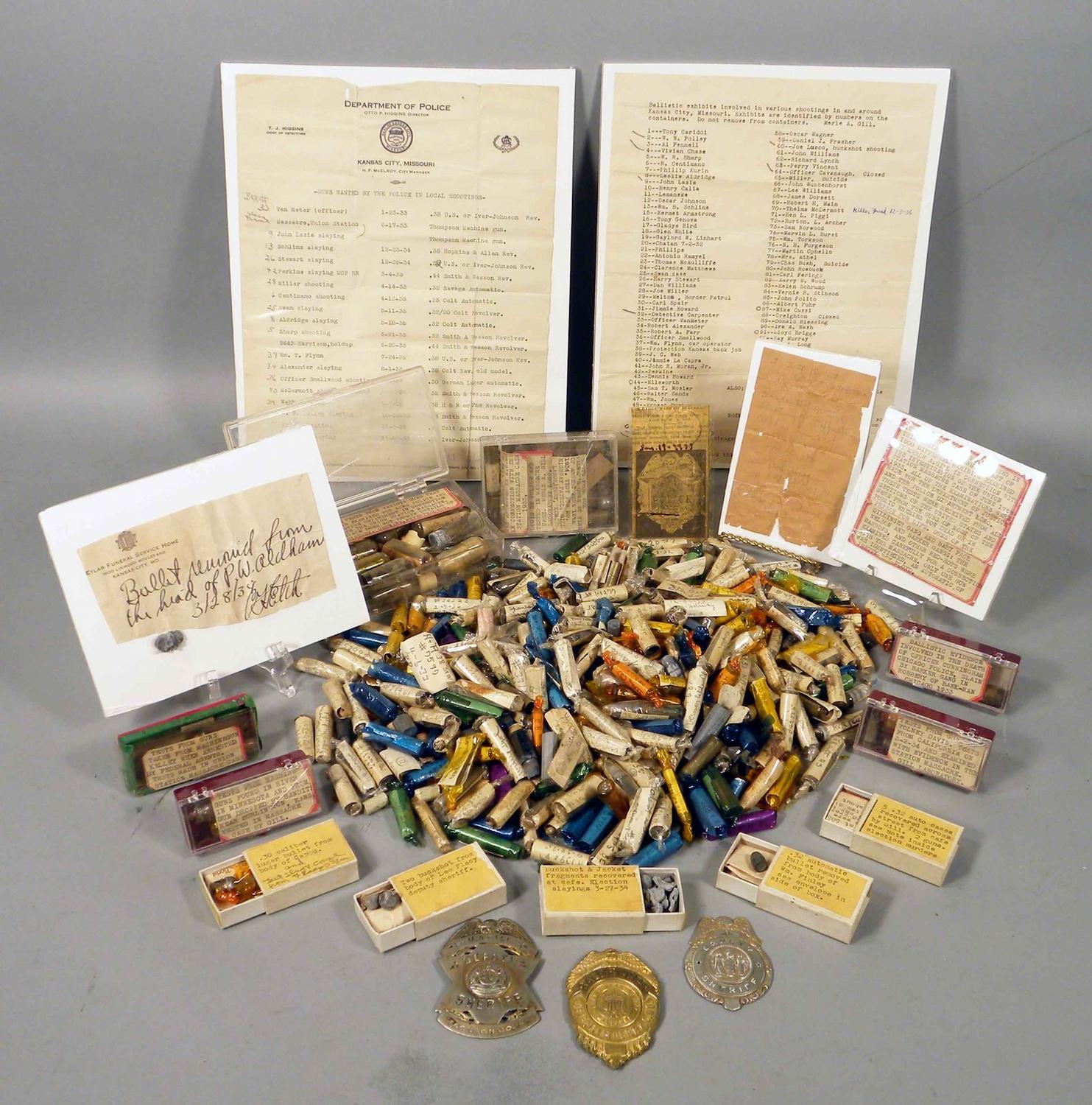 Wayne Turner's, Undersheriff Ballistics Collection. Over 1,000 labeled bullets and slugs taken from bodies and crime locations throughout Kansas and Missouri in the 1930's. Turner's collection resembles the "Who's Who" among gangsters of that era. Complete with slugs from guns fired by such reputed criminals as "Machine Gun" Kelly, "Baby Face" Nelson, Ma Barker and Clyde Barrow. Included with this collection is a copy of a newspaper article about the slug that killed Dillinger supposedly included in the mix. We did not take the time to go thru each slug and attempt to find it. Also, included in the lot are all three of Undersheriff Turner's badges he wore during the time he worked as a ballistics expert in the Kansas City Police Department, Kansas City, MO. A rare opportunity to own an important piece of history.