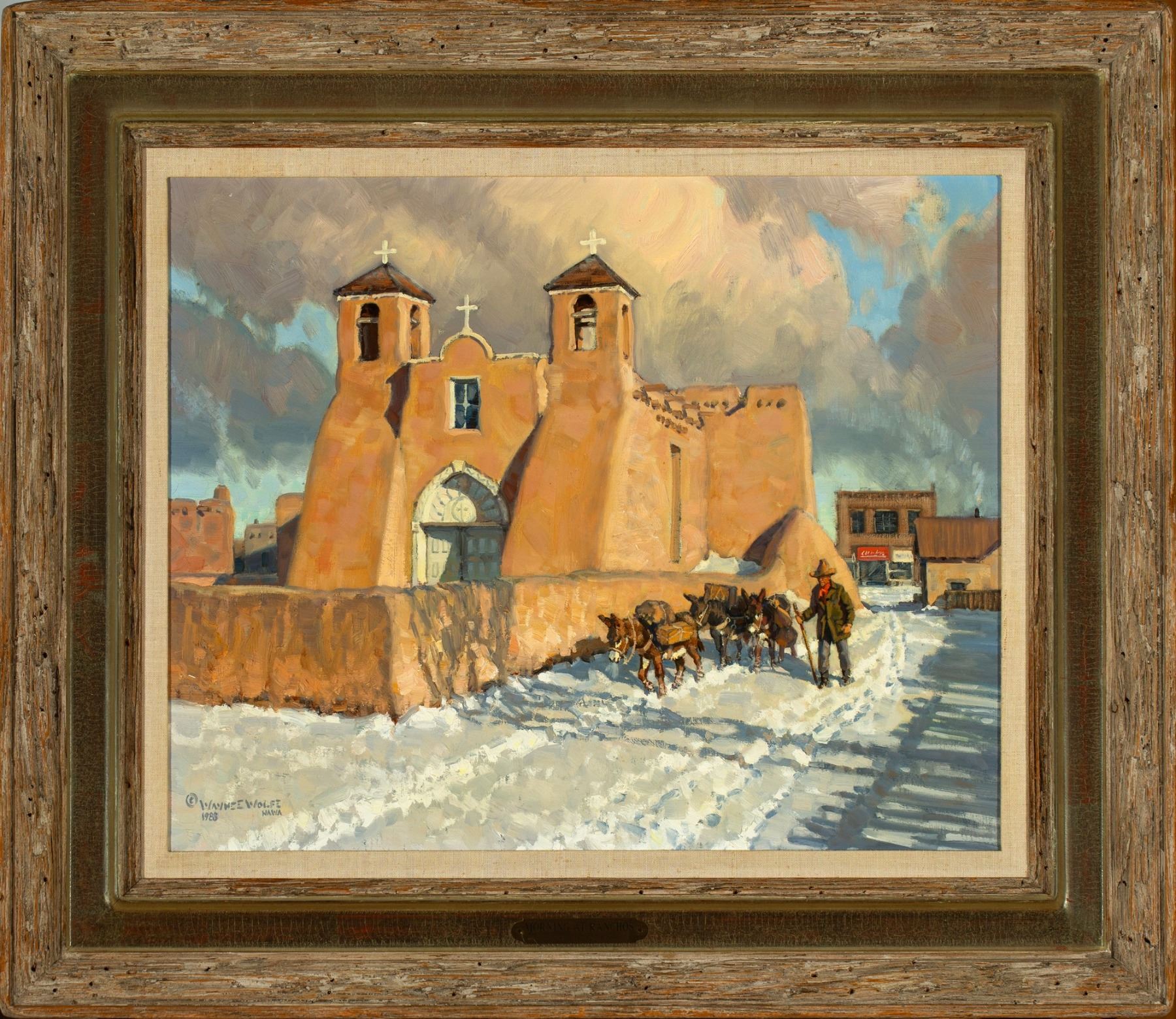 Signed lower left: C Wayne Wolfe / 1988 / NAWA. Wayne Wolfe’s painting of the San Francisco de Asís Mission Church captures the iconic adobe structure, built between 1772 and 1816, against a wintry landscape, where a lone traveler and his burros evoke the quiet resilience of life in historic Northern New Mexico.