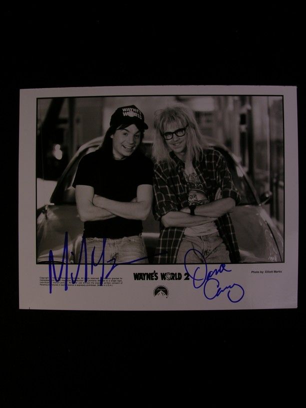 An autographed, B&W glossy still of Mike Myers and Dana Carvey from the 1992 Penelope Spheeris comedy 'Wayne's World 2.' The photo features Myers and Carvey as their characters Wayne Campbell and Garth Algar, sitting in front of their car. Photo is signed by the actors in blue felt pen. (measures approx. 8"x 10")