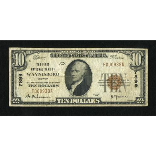 <B>Waynesboro, GA</B></I> - $10 1929 Ty. 1 <B>The First NB</B></I> Ch. # 7899<BR> A none too common bank in small as well, with this one of the very few decent grade examples known. <B>Fine-Very Fine.</B></I> <BR><I>From The Amelia Island Collection.</B></I><BR><BR><b>Shipping:</b> Coins & Currency (<a target="_blank" href="http://www.heritageauctions.com/common/shipping.php">view shipping information</a>)