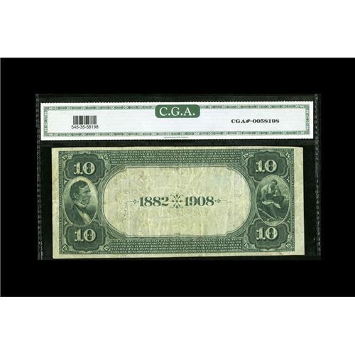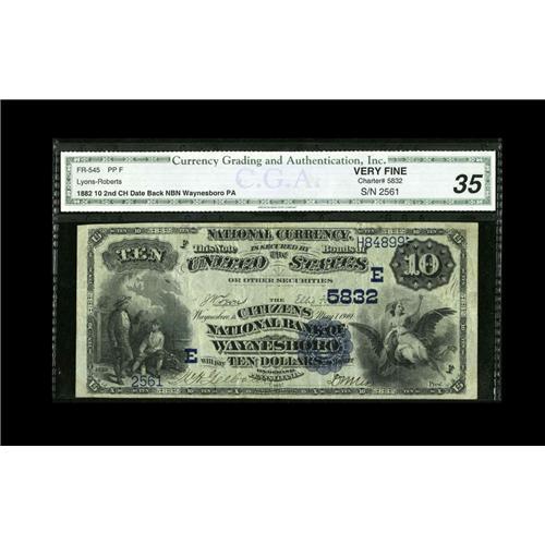 <B>Waynesboro, PA</B></I> - $10 1882 Date Back Fr. 545 <B>The Citizens NB </B></I> Ch. # (E)5832<BR>A well centered <B>CGA Very Fine 35</B></I> with signatures as strong and vivid as the day they were laid down on the still bright paper.