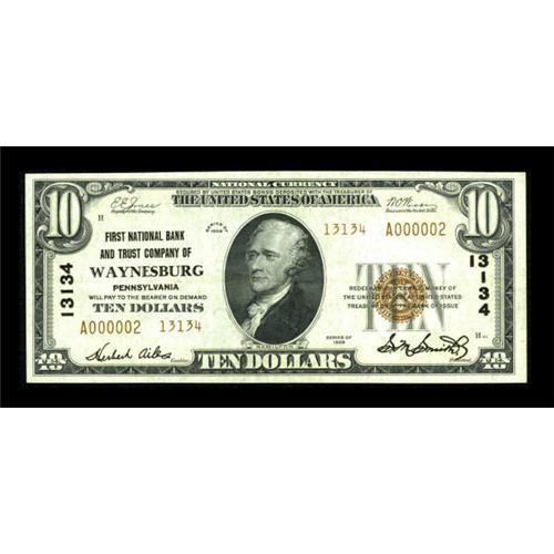 <B>Waynesburg, PA</B></I> - $10 1929 Ty. 2 <B>First NB & TC</B></I> Ch. # 13134<BR> An attractive specimen bearing single digit serial number A000002. Surprisingly, this is the only reported survivor from this bank's number 1 sheet. <B>About Uncirculated.</B></I><BR><BR><b>Shipping:</b> Coins & Currency (<a target="_blank" href="http://www.heritageauctions.com/common/shipping.php">view shipping information</a>)