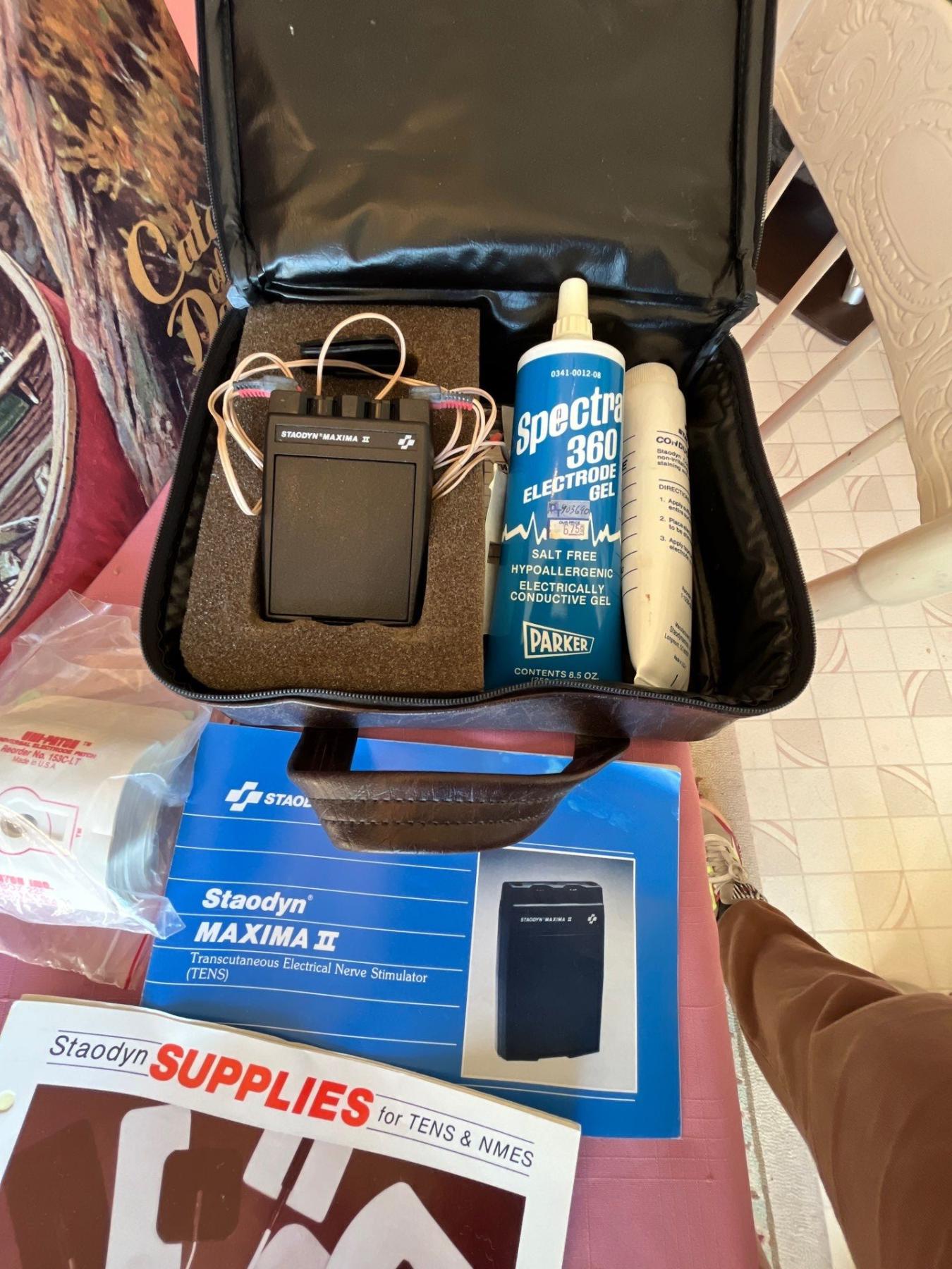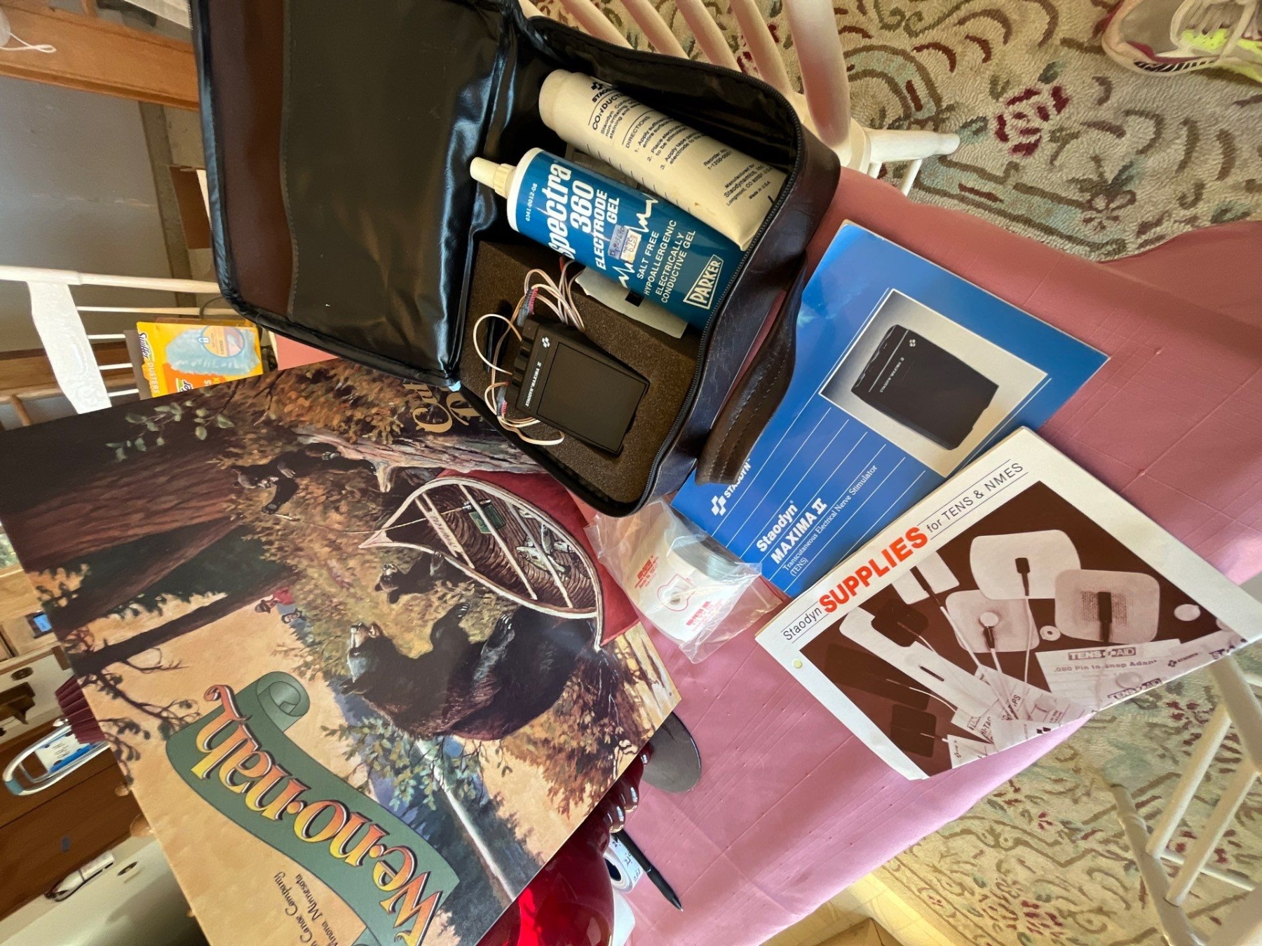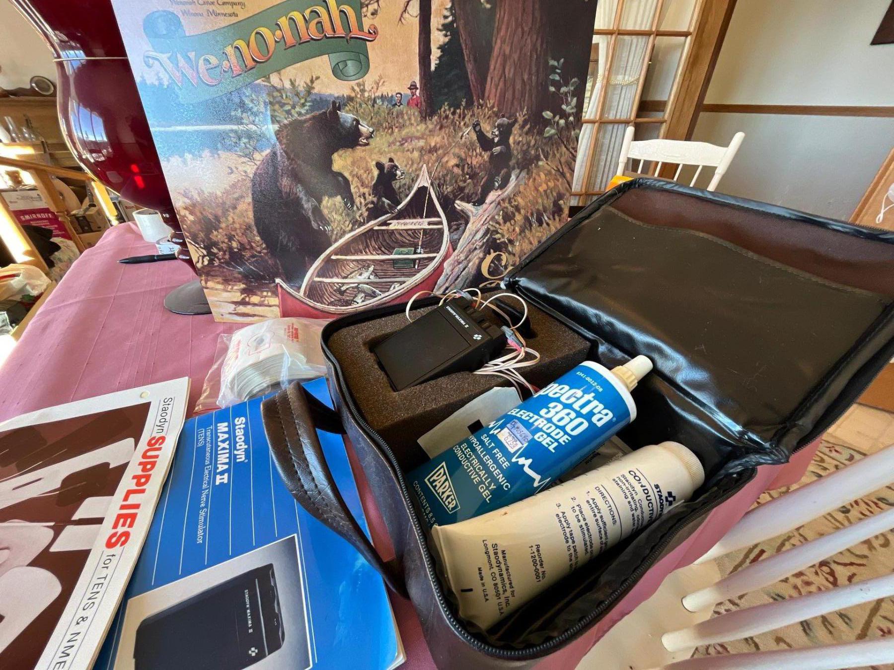 We-no-nah vintage sign and a STEODYN Maxima, two nerve stimulator