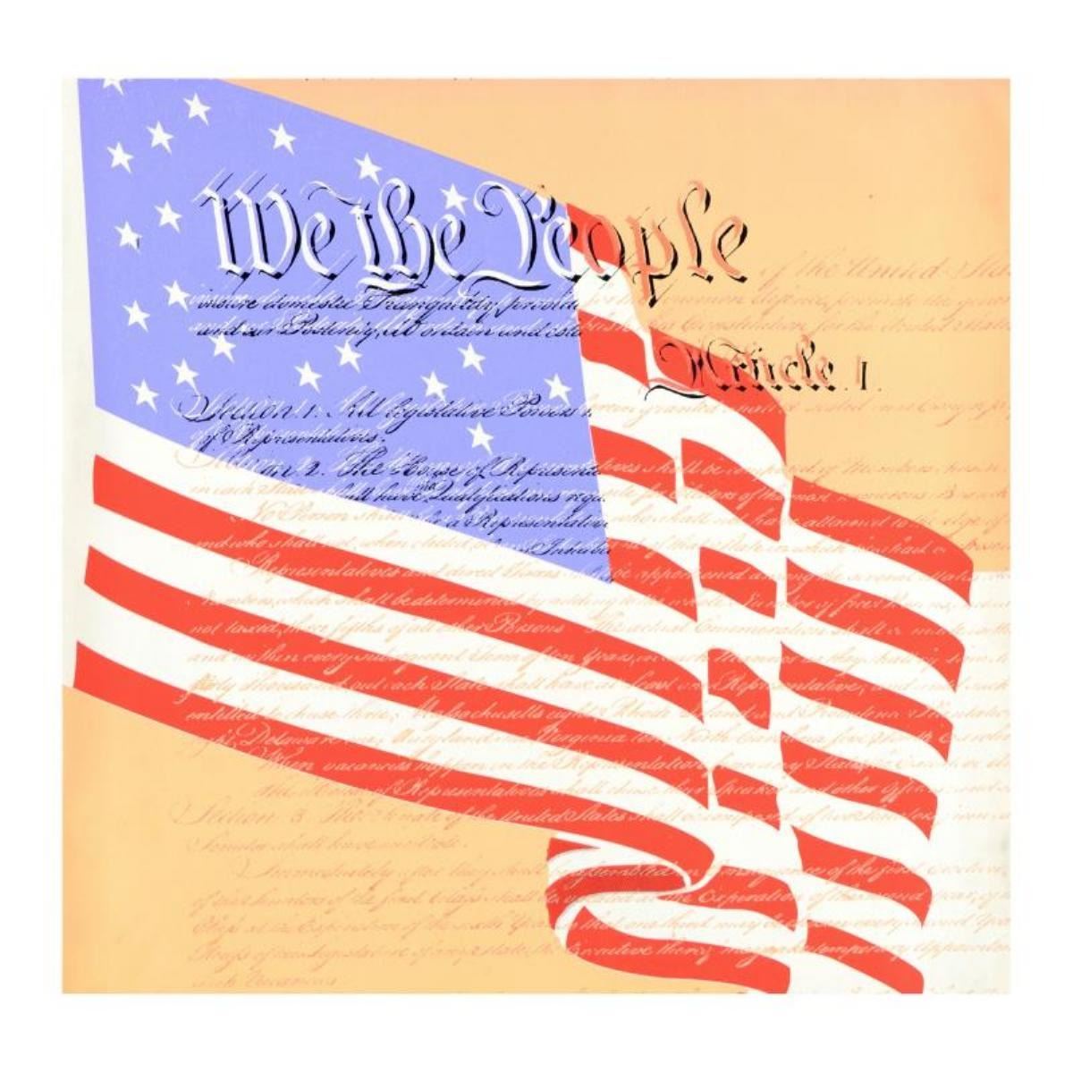 "We the People" is a hand pulled limited edition silkscreen on canvas by Andy Warhol protege Steve Kaufman (1960-2010). This piece is numbered 32/100 and hand signed inverso. Includes Certificate of Authenticity. Measures approx. 24" x 24" (image). This piece has creases in the border area due to being previously stretched.