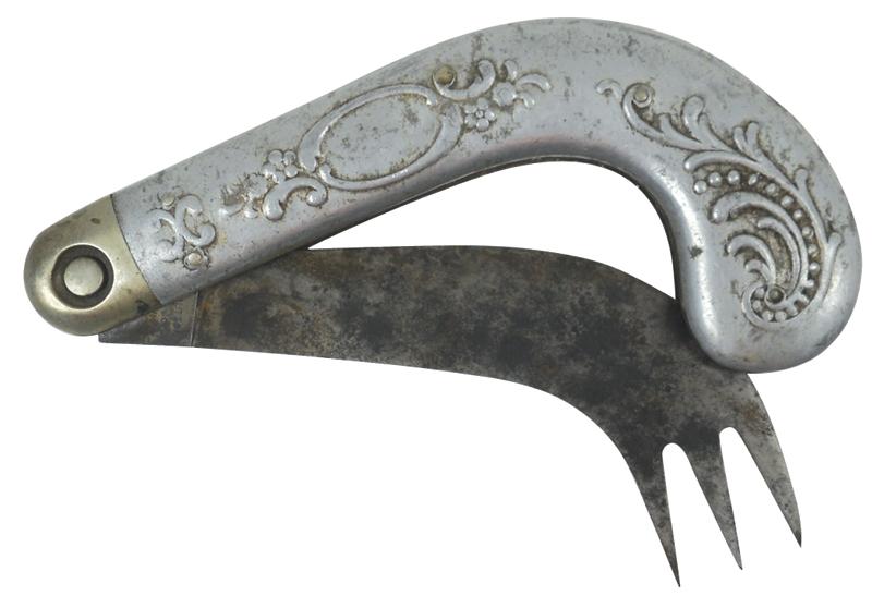 Weapon, one-arm knife w/aluminum handle & switchblade fork by Press Button Knife Co.-Walden, NY, ope