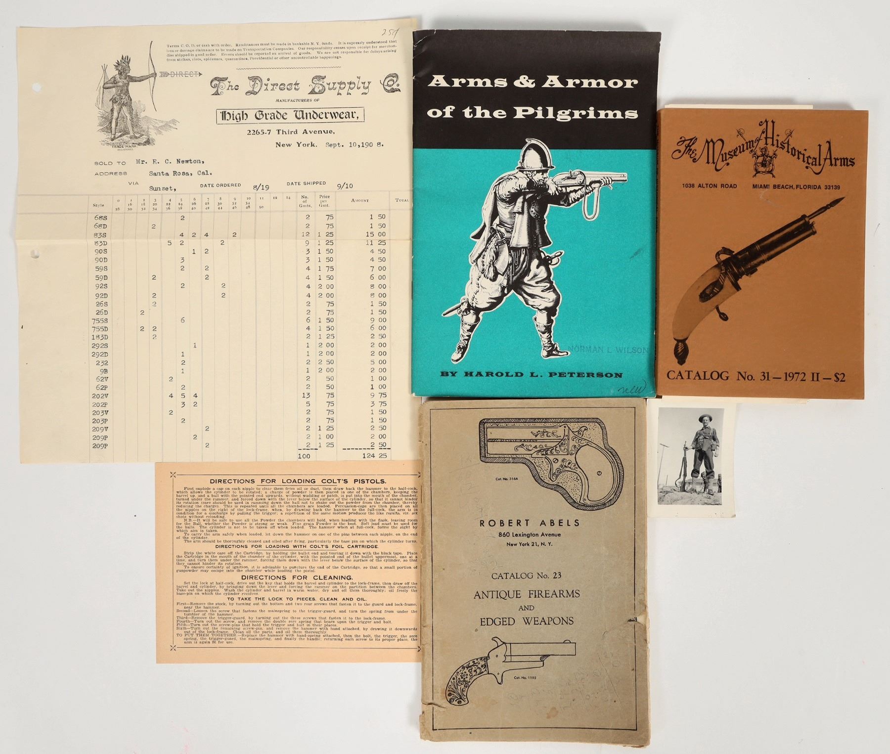 Vintage ephemera group of items relating to firearms and other weapons. Lot contains a dealer's catalogue of antique firearms and weapons from Robert Abels of NYC; a 1972 catalog from the Museum of Historical Arms; a 1957 booklet titled "Arms & Armor of the Pilgrims" by Harold Peterson; a small photo of a man with a rifle; and a direction sheet for taking care of Colt pistols. Varying condition, see photos.