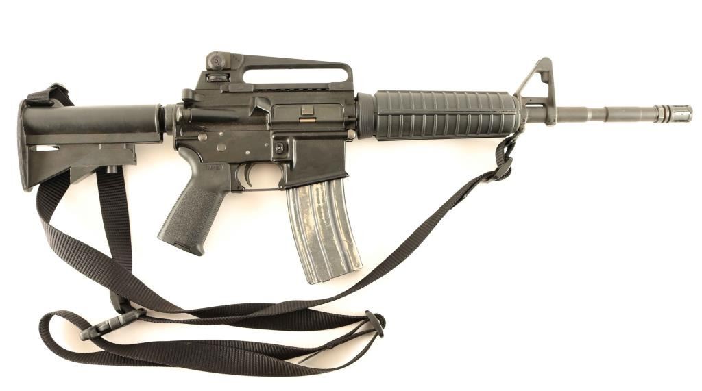 SN: 26828 'Fully Transferable' Select-fire M4 carbine configured assault rifle chambered in 5.56x45mm NATO, converted by S.G.W. utilizing an Olympic Arms receiver. Features a matte black finish, M4 profile 14.5" barrel, carbine length gas system, A1 birdcage flash hider, elevation adjustable A2 shrouded post front sight without bayonet lug, flat-top upper receiver, removable carry handle with A2 adjustable "L" dual aperture rear sight, forward assist, dust cover, shell deflector, standard M16 fire control group, M16 bolt carrier, standard charging handle, push button magazine release, 30 round Parsons Precision Products magazine, black nylon sling, black Magul MOE pistol grip with storage compartment, ventilated carbine length handguard, and three-position collapsible carbine shoulder stock. Machine gun exhibits approximately 96% of it's matte black finish showing some edge wear around the ejection port, slide wear on the top of the lower receiver from the charging handle and light handling marks/scuffs. Action is sound, the bore is excellent, marking are clear and the synthetic stocks are fine. Condition is Excellent. ***NFA Firearm***