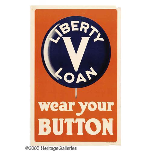<B> Wear your Button </B></I> (Lot of 2) 30"x 20" Artist: unsigned. Printed for the Liberty Loan Committee. This poster is fairly plain, depicting a large, oversized button with a "V" on it and the words "Liberty Loan." Liberty buttons were given out as certain amounts of bonds were bought. The more bonds you bought the more buttons you got. A simple and entertaining piece for a huge cause! <r<r Condition-Poster 1-Fine; mild folding and creases on left edges, normal wear from rolling/storage. <r<r Poster 2-Superior; excellent!!