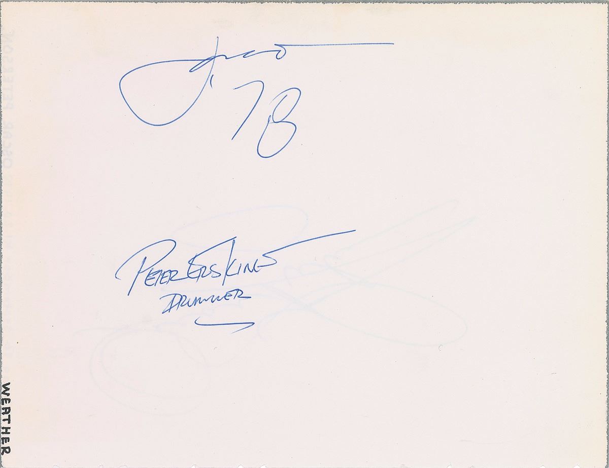 American jazz fusion band of the 1970s and early 1980s regarded as one of the preeminent early jazz fusion acts; the group routinely employed some of the world’s greatest musicians. Blue ballpoint signatures, “Jaco [Pastorius] ‘78,” “Peter Erskine, drummer,” and “Wayne Shorter,” on a pair of white 7.5 x 9.75 album pages. In fine condition.