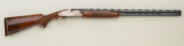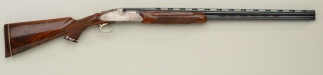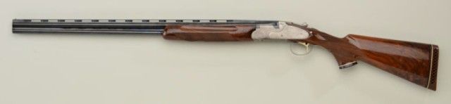 Weatherby Athena grade 410 gauge over and under shotgun showing 28" barrels ventilated rib, single trigger, auto ejector, removable side plates, scroll engraving, select checkered wood stocks, serial #FF00119 choked full over mod. The metal is in fine to near excellent condition showing minor use and slight storage 98-99%. Some scratches and mars in wood which are mostly in the varnish on the buttstock and wood is rated at verygood only. Easy to fix with a light refinish. The stock measures 13-1/4" to the end of the wood and 14"to the end of a Weatherby pad. Robert E. Petersen collection. Est.; $800-$1,600.