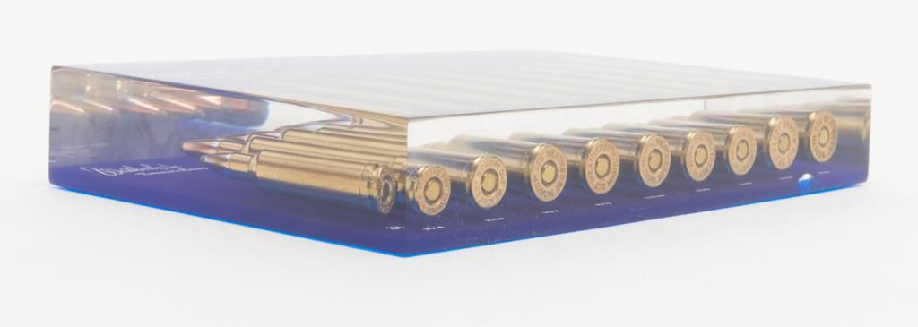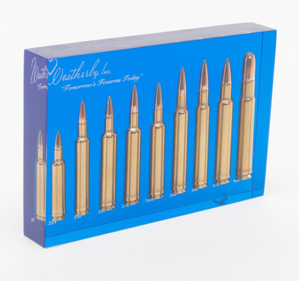 Weatherby Cartridge display in Lucite block; 9 cartridges ranging in size from .224 caliber to .460 caliber; a great display piece. Est.: $50-$100.