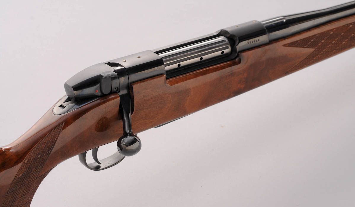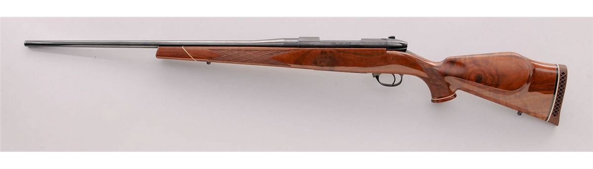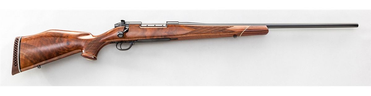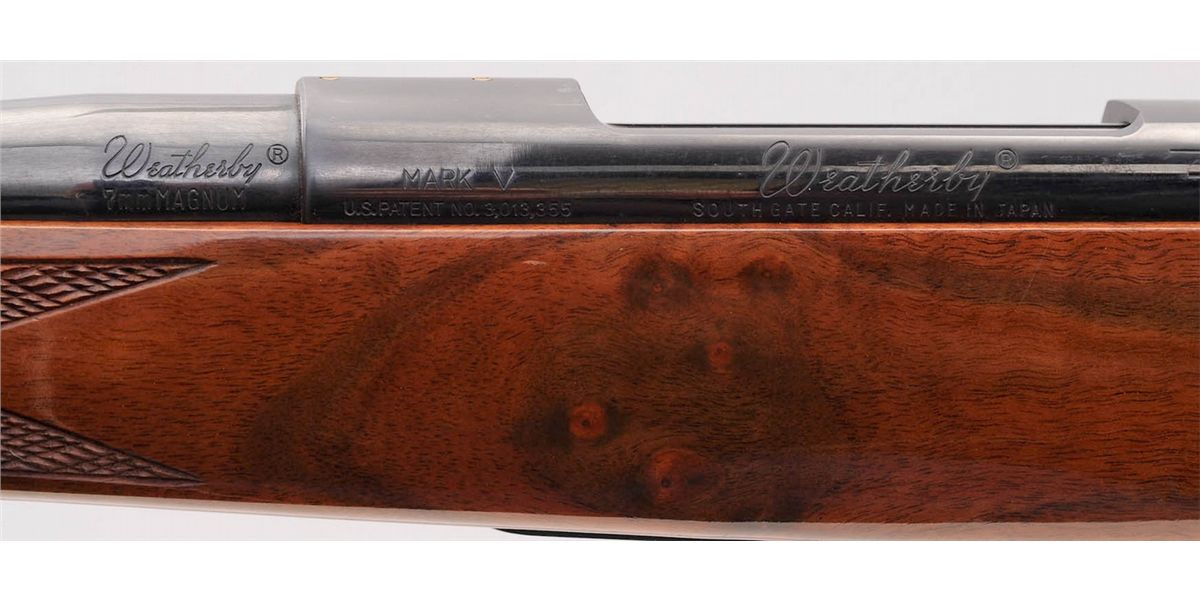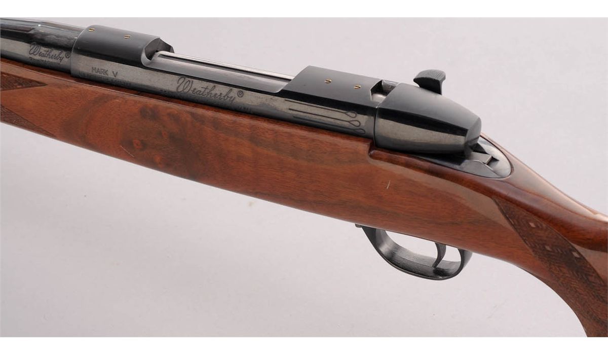 Weatherby MK V Bolt Action Rifle, #H64854, 7mm Wea. mag. cal., 24'' barrel, royal blue finish, fancy skipline checkered stock with cheekpiece, rosewood pistol and forend cap. Condition is excellent showing only light marks from handling. Action remains crisp, bore is mirror bright. Est.: $750-$1,000. (Modern)