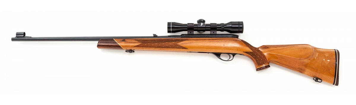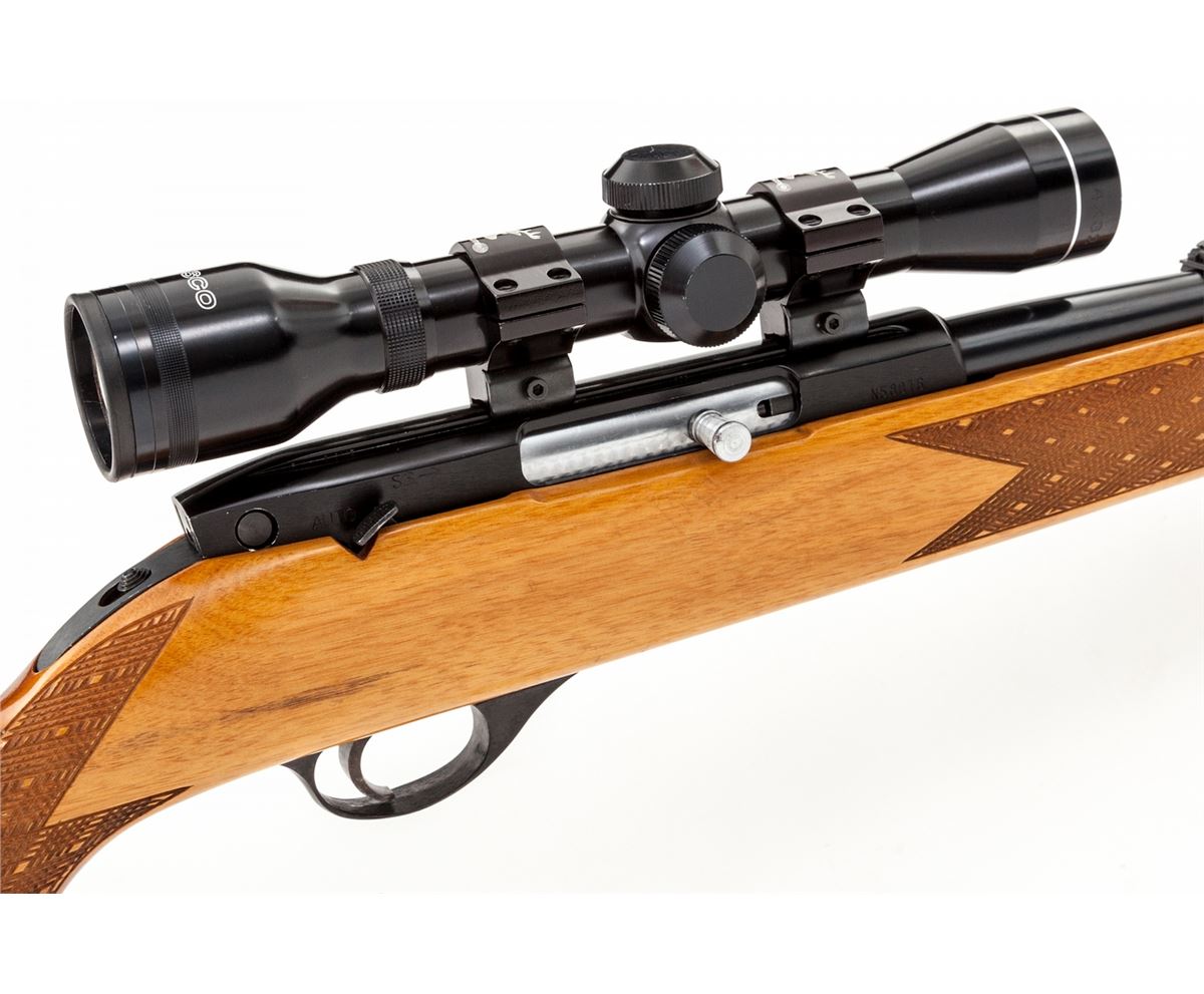 Weatherby MK XXII Semi-Automatic Rifle, #N58016, .22 LR cal., 24'' barrel, blue finish, fancy skipline checkered walnut stock, with rosewood pistol grip and forend cap with maple spacers, and two (2) extra 10-round magazines. Topped with a Tasco 4x32 scope on Weaver style scope rings. Condition is excellent showing just light marks from handling with minor impressions to stock. Action is crisp, bore is fine. Est.: $500-$750. (Modern)