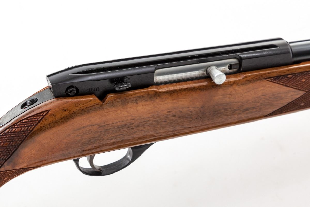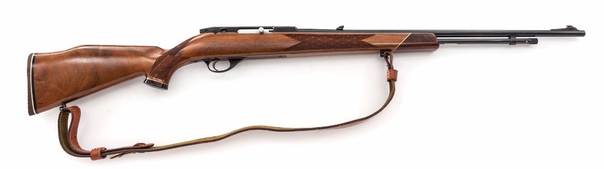 Weatherby MK XXII Tube-Fed Semi-Automatic Rifle, #T16439, .22 LR cal., 24'' blue barrel, dark blue/black alloy receiver, fancy skipline checkered pistol-grip walnut stock with cheekpiece, rosewood forend and grip cap, with factory basketweave pattern Weatherby brown rubber recoil pad, ramp bladed brass bead front sight and folding notched rear sight; sling swivels and an unmarked brown leather sling. Made in Japan. Condition is excellent retaining approx. 98% finish with small marks from handling to barrel and a few minor marks to the grooved edge of receiver. Skipline checkering is like new. Buttstock with a few moderate impressions to the right side. Action and bore are excellent. Est.: $600-$800. (Modern)