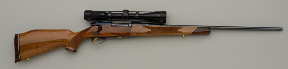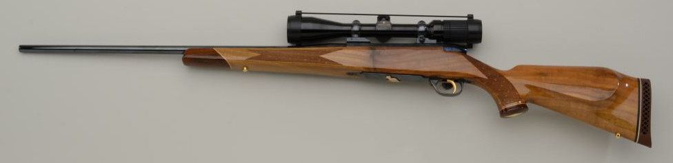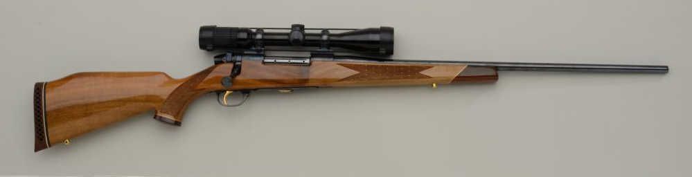 Weatherby Mark 5 bolt action high-power sporting rifle in 7 mm Weatherby Magnum caliber, mounted with Bausch and Lomb 3x9 power scope on Bueller mounts, Serial number H138839. The rifle shows a select qualitycheckered light colored walnut stock with fancy forend cap, exotic hardwood grip cap and matching forend and a gold overlaid figure of Big Horn sheep on trigger guard with gold plated trigger and quick detachable sling swivel studs. The rifle remains in fine to near excellent condition with 98% to 99% plus original finish and the stock shows just some slight handling and minor use. The rifle is fitted with a Weatherby recoil pad.Est.: $800-$1,600.