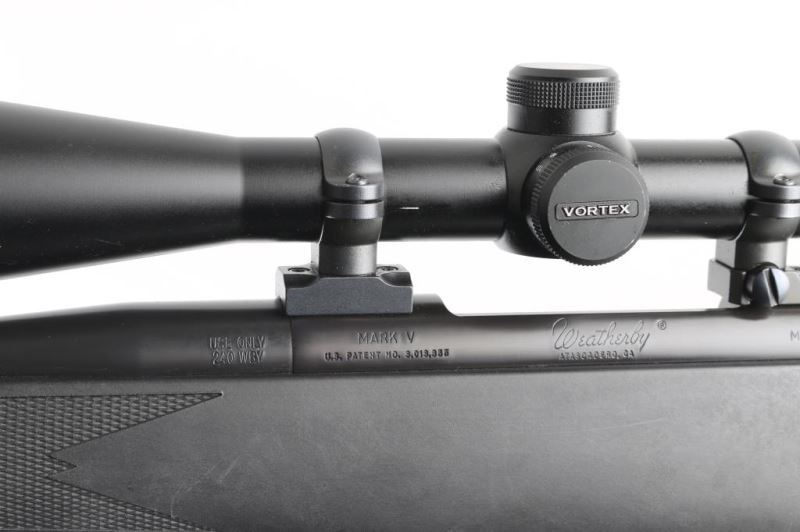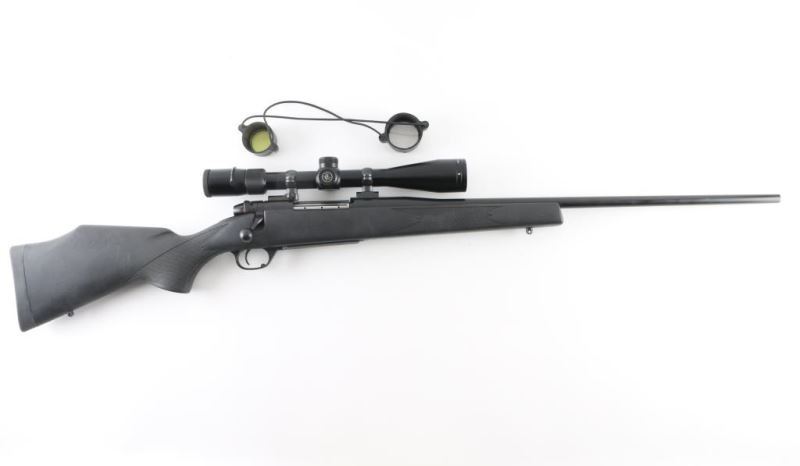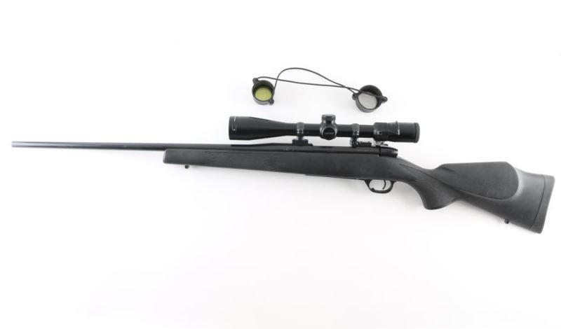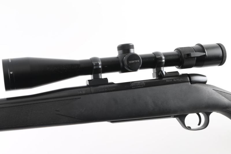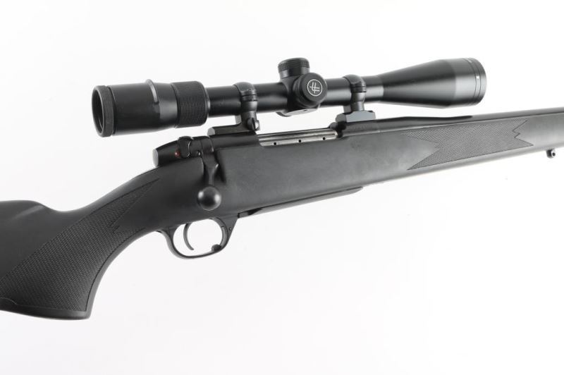 Bolt action rifle made in the USA. Features blued finish, black composite stock with checkering panels at wrist & forend, solid rubber butt pad, sling studs, 24" barrel, no metallic sights, two piece Leupold base & rings, hinged floorplate, manual safety. Bore is very good condition. Retains 98% dark bluing, with handling marks & edge losses. Stock is excellent condition. Mounts a near new condition Vortex Viper 4-12x40mm scope with clear view. Condition is NRA Excellent - like new