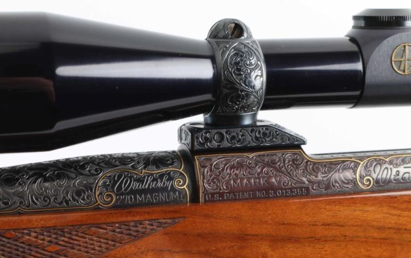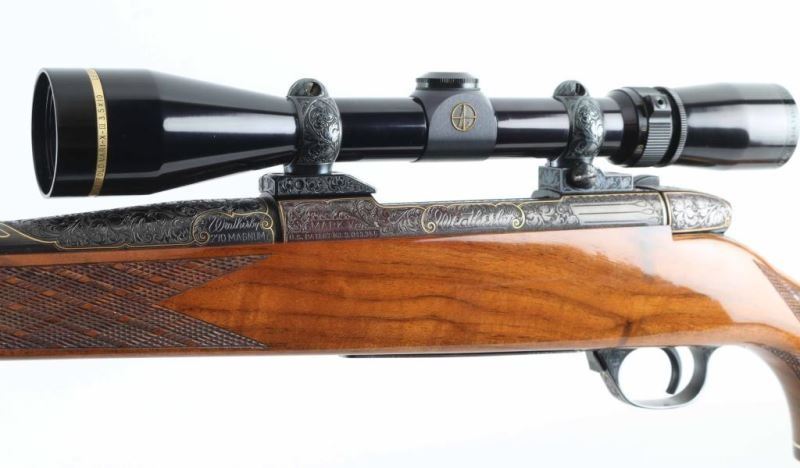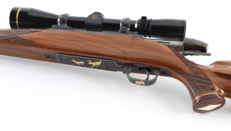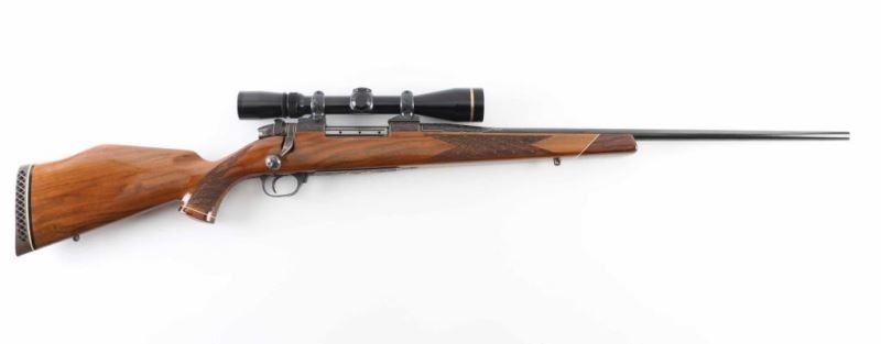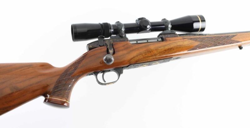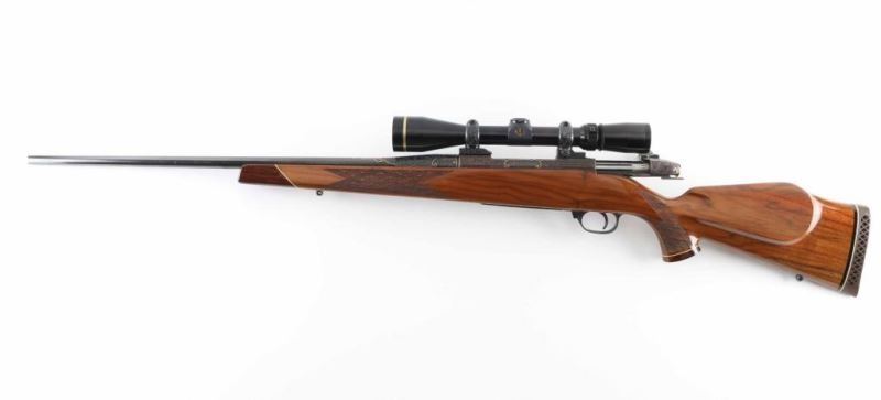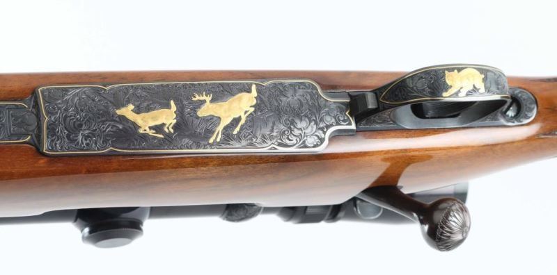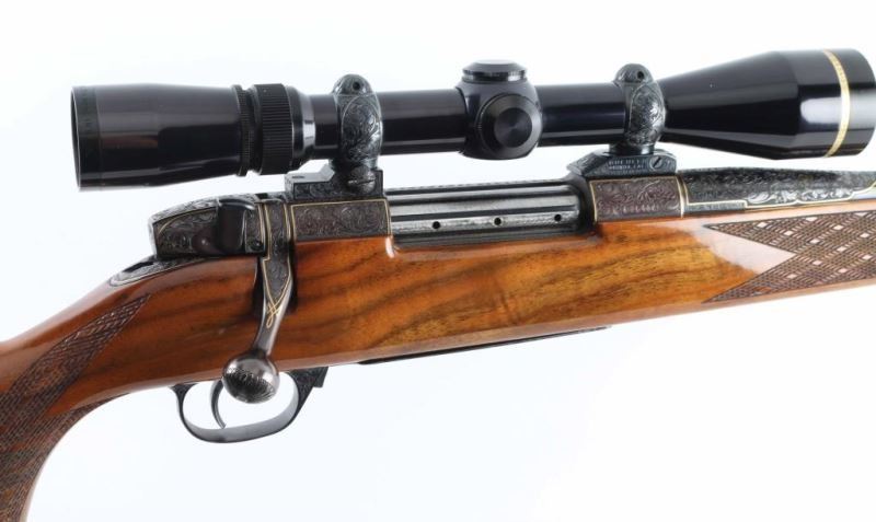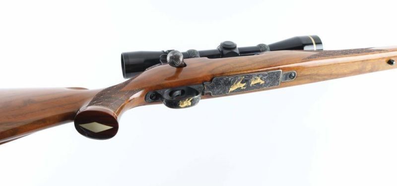 Deluxe Engraved and Gold Inlaid bolt action rifle made in West Germany. Features blued finish, fancy figured walnut stock, 24" barrel, no sights, two piece Buehler scope base & rings, manual safety on right side of bolt shroud, sling studs, ventilated rubber recoil pad. Stock is Monte Carlo styled with contrasting grip cap & forend tip, white diamond inset on grip cap, curved grip, high combed right hand cheek piece, checkered panels at wrist & forend. Engraving covers the entire action, the scope bases & rings, and rear portion of the barrel with floral scrolls, inlaid gold wire borders & accents, and animals in game scenes. Inlaid gold animals include a game scene on floorplate with two leaping deer, and a bobcat on the triggerguard bow. Bore is excellent condition. Retains 99% blue with handling marks, small ding to barrel. Stock is very good condition with few minor blemishes. Mounts a very good condition Leupold VARI-X III 3.5x10x scope, duplex reticle, clear optics. Condition is NRA Excellent *** Modern Firearm ***