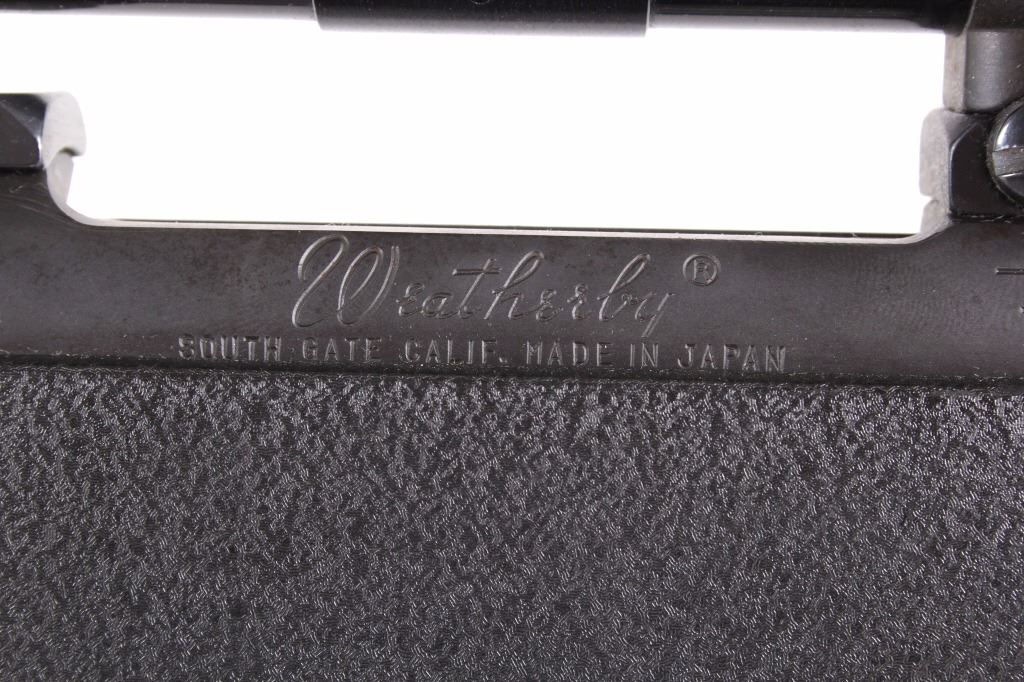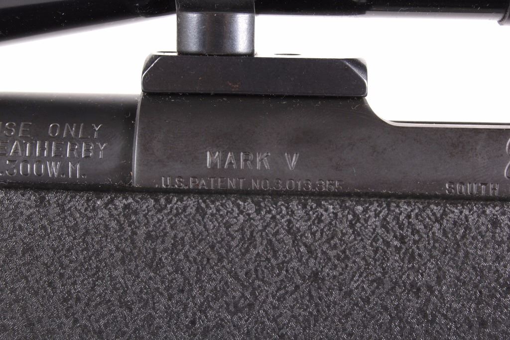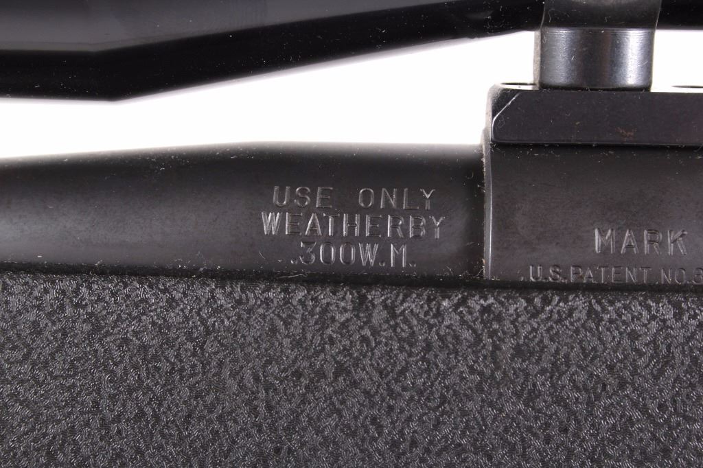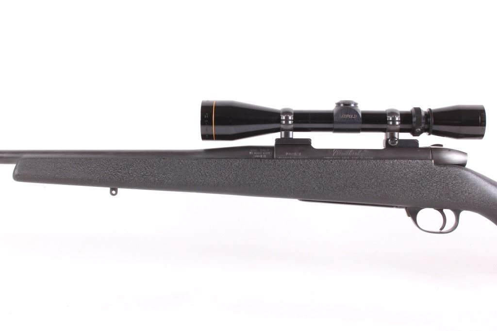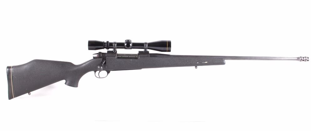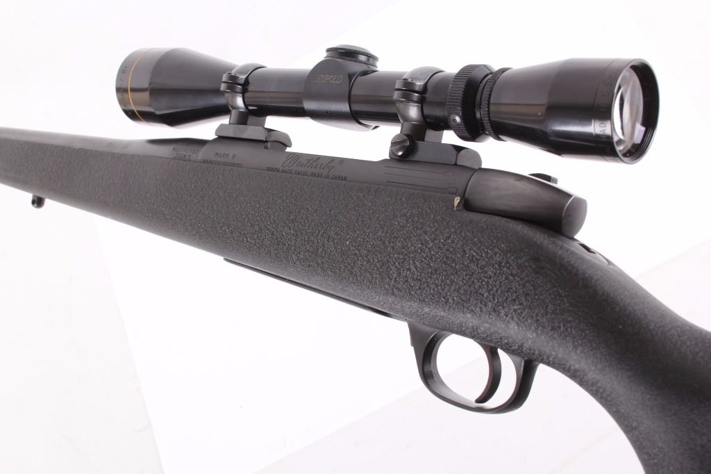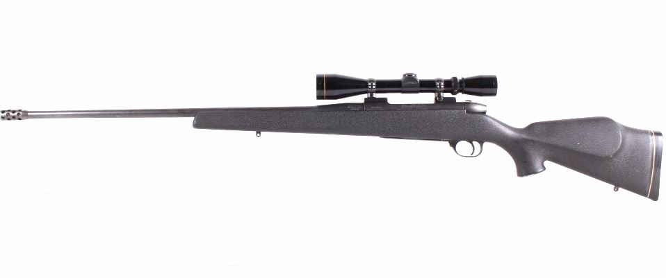 This lot features Weatherby Mark V in Weatherby .300 Weatherby Magnum with a Leopold 3x9 Vari-X II scope. This rifle features a synthetic Monte Carlo stock, 25 1/4" barrel, matte blued finish, and a muzzle brake. This is a Japanese rifle that shows much of the original bluing, with some wear on the barrel and bolt. The stock is in good condition with only a few minor handling marks overall. The scope has clear optics. The overall length is 46 1/2." The serial number is H164885. Modern Rifle. FFL transfer or NICS background check required
