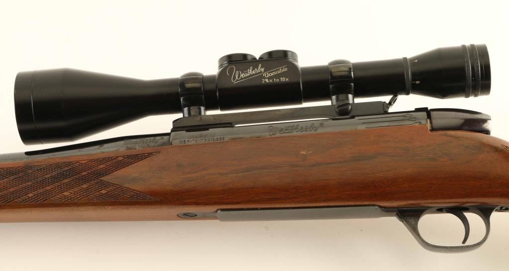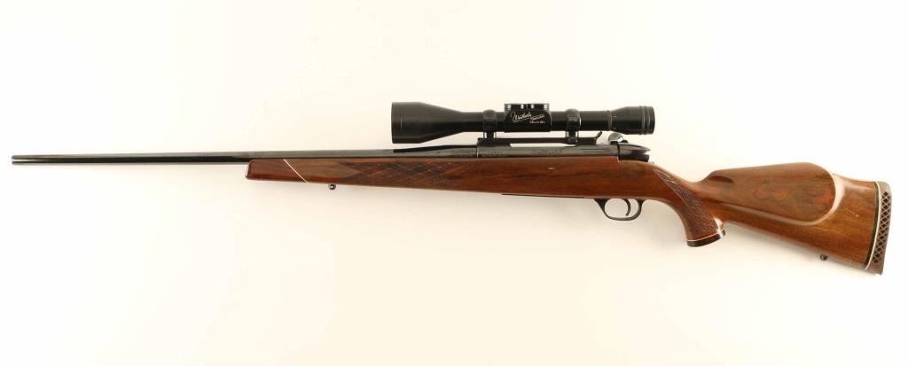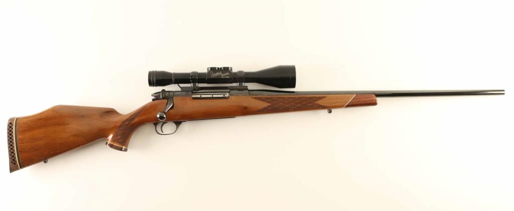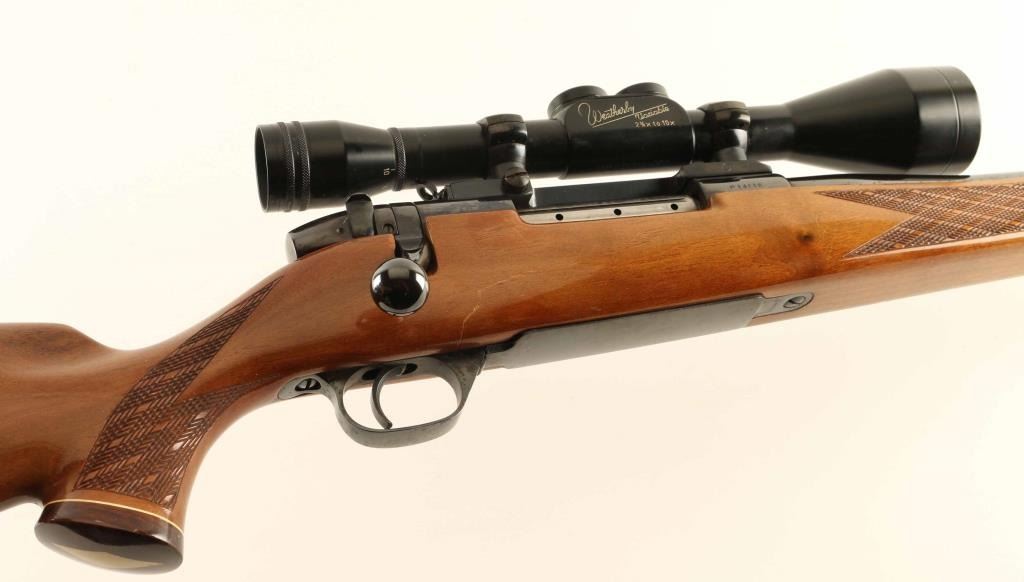Rifle, bolt-action. made in west Germany (1960's) High luster blue finish. deluxe checkered Monte Carlo stock. Sling swivel studs, rubber recoil pad. 24" barrel. Bore appears excellent/bright. 3-lug chrome bolt. 5-rd magazine. Action is smooth/tight. Blued finish is about 97%, with some minor scratches, and a couple of small chips on the barrel. Wood is very good overall, with some scratches, and a very small chip on the right side/receiver area. Mounted with a Weatherby 2 3/4X to 10X variable scope. clear optics. Overall a beautiful rifle. NRA Condition-very good. Modern firearm.