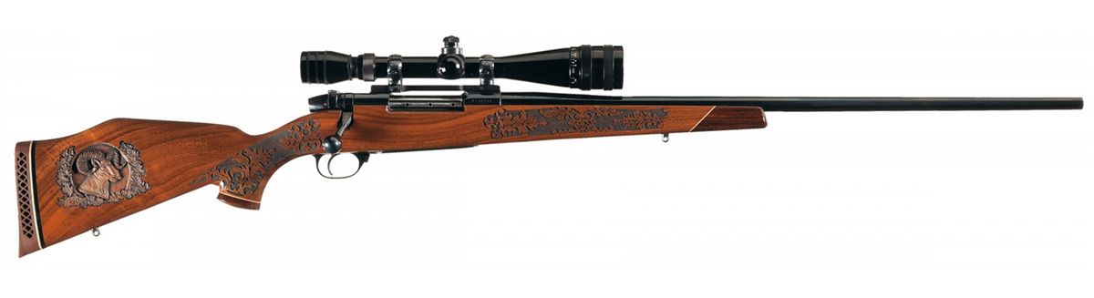 Manufactured between 1972 and 1995 in Japan. Standard markings. The barrel was manufactured without sight provisions and there is a Redfield 4-12x scope on a Redfield base mounted on the receiver. The upper rings are engraved. Five round magazine, hinged floor plate and mounted with a one-piece high gloss walnut pistol grip stock with contrasting forend and grip cap, cheek piece, relief carved leaf and vine designs on the forearm, wrist and left rear of the buttstock, and inset relief carved big horn sheep with oak leaf bordering on the right side, and vented Weatherby recoil pad. Comes with a Weatherby Gun-Guard hard case.