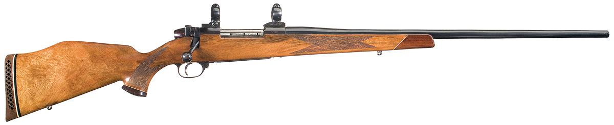 Manufactured in Germany, tapered blue barrel manufactured without sights, a fluted bolt and mounted with Buehler scope rings. Fitted with a Monte Carlo style stock with skip line checkering, a rose wood grip cap and forend tip, sling studs and a vented rubber Weatherby recoil pad.
