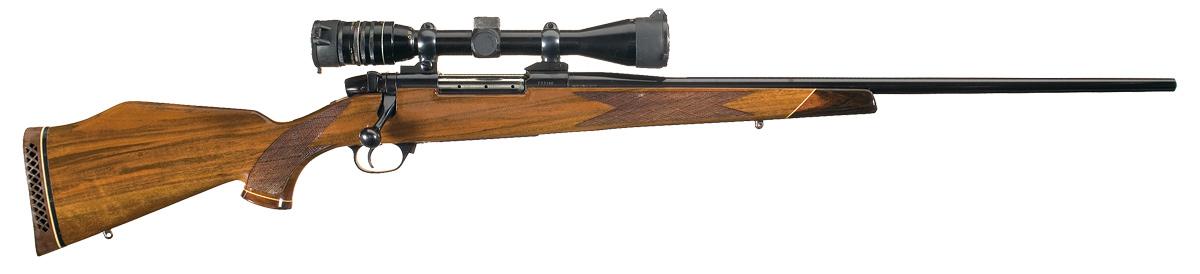 Manufactured in Germany. Features a tapered barrel without sights, a polished and fluted bolt and is mounted with a Weatherby Premier 3x-9x40 scope with rubber lens caps. Fitted with a fancy checkered Monte Carlo style stock with skip line checkering, rose wood forend tip and grip cap, sling swivel studs and a vented Weatherby rubber recoil pad.
