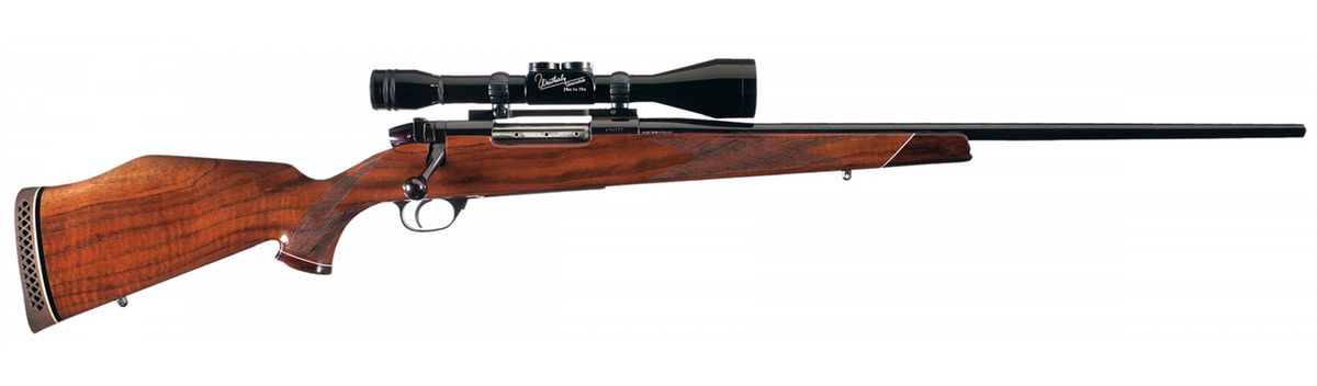 Manufactured in 1970 in West Germany with standard markings. One piece Monte Carlo style walnut pistol grip stock with rosewood forend tip and grip cap with diamond insert, skip-line checkering, raised comb and cheek piece and vented rubber Weatherby recoil pad. No sights, Weatherby 2 3/4-10X scope mounted on Redfield Jr base and scope rings. Comes with manual.