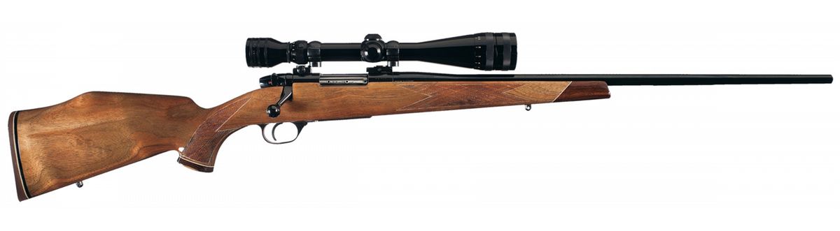 Manufactured in 1966 in West Germany with standard markings. One piece Monte Carlo style walnut pistol grip stock with rosewood forend tip and grip cap with diamond insert, skip-line checkering, raised comb and cheek piece and vented rubber Weatherby recoil pad. No sights, Redfield 4-12X scope mounted on Redfield base and scope rings. Comes with manual.