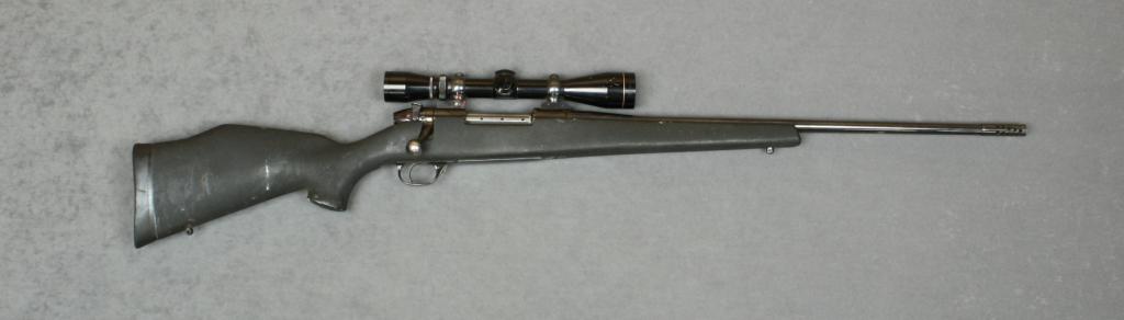 Weatherby Mark V bolt-action rifle, .300 Magnum cal., 24” barrel, blue finish, synthetic stock, #H100593, Leupold scope. This gun is in overall fine condition showing the majority of its blue finish, fine bore,crisp action and markings, very good stock; optics of scope are very good. Est.: $600-$1,200.