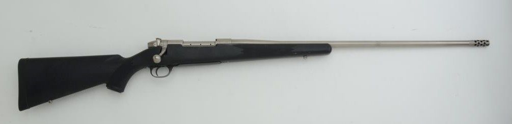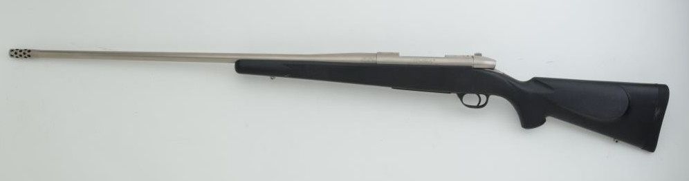 Weatherby Mark V bolt action rifle, .340 WBY Mag. cal., 28” barrel including muzzle break, satin finish, receiver tapped for scope mounts, checkered black composite stock, #H2571109 in overall fine condition with afine bore, crisp action and fine stock. Est.: $700-$1,400.