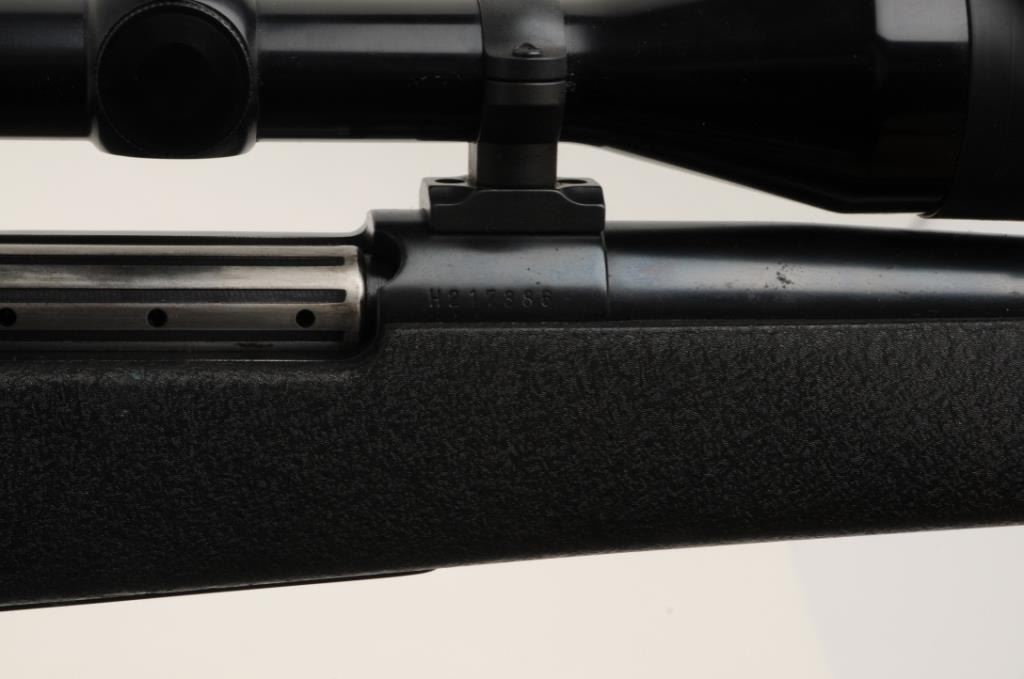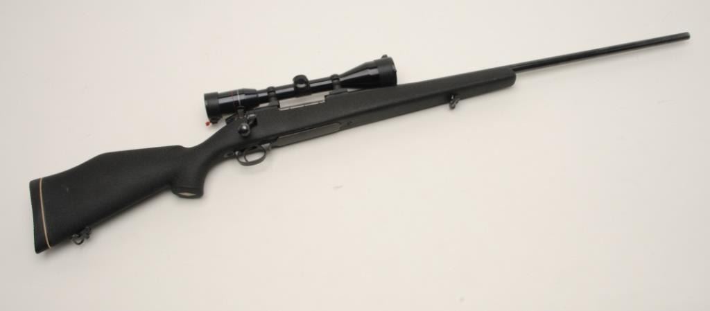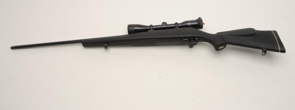 Weatherby Mark V bolt action rifle, .340 WBY Mag. caliber, 26.5” barrel, composite stock, S/N H217386, mounted with a Weatherby Supreme 4x44 scope with sharp optics; rifle is in overall fine condition with a fine bore,crisp action, sharp markings and fine stock. (Modern). Est.: $900-$1,800.