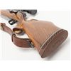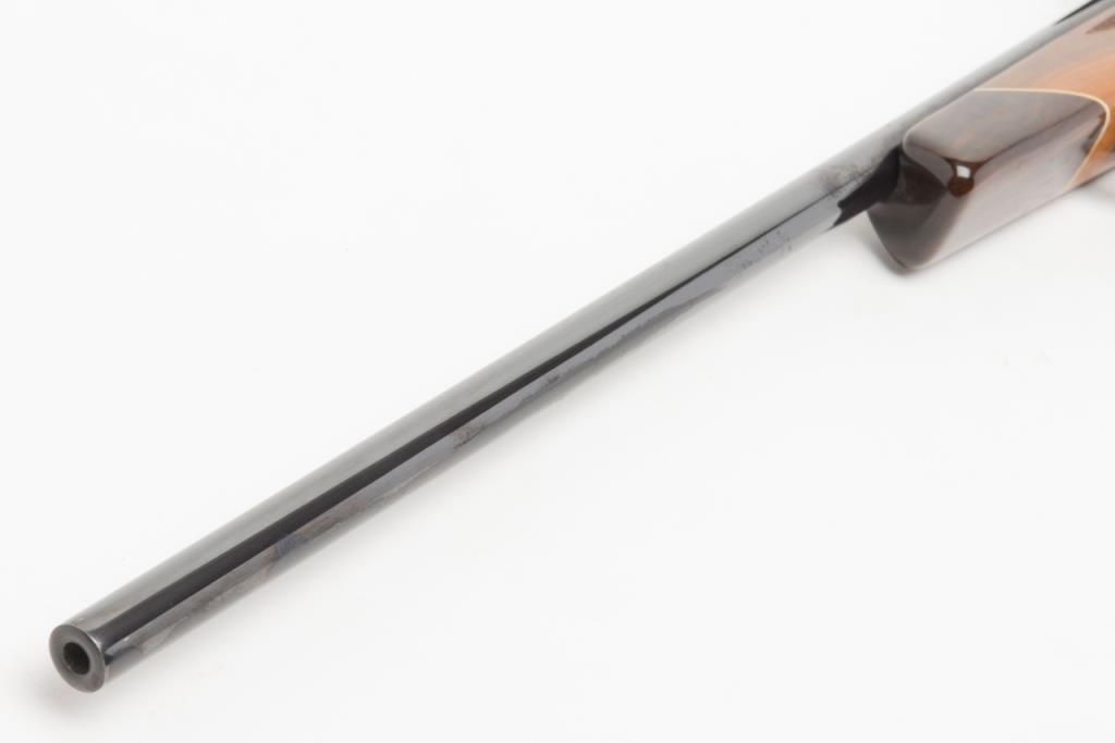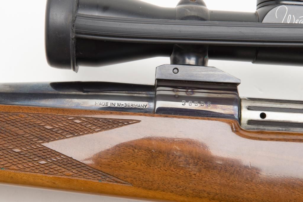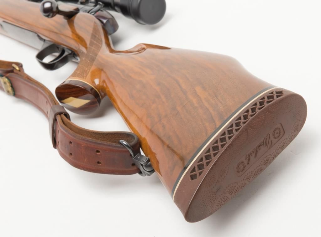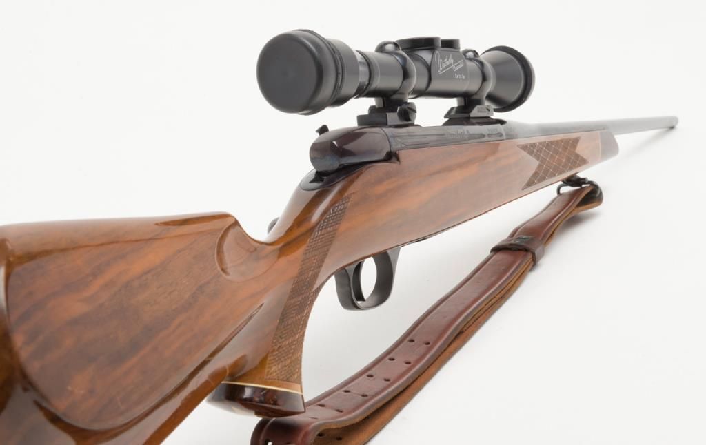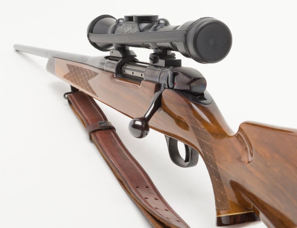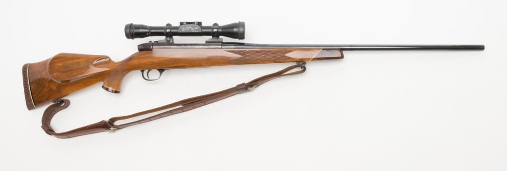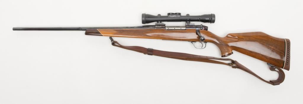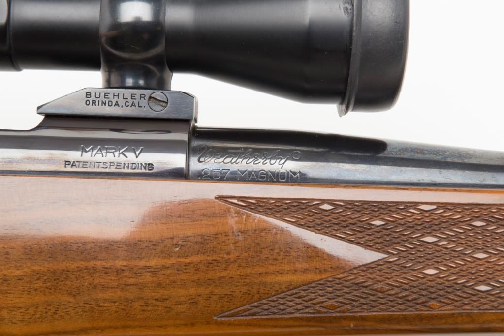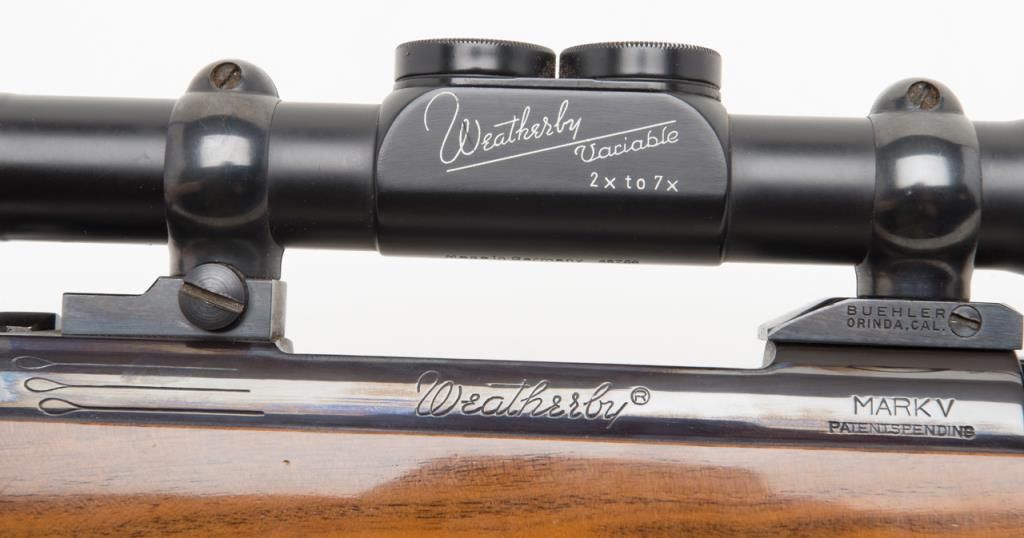 Weatherby Mark V bolt action rifle, set-up for a left-handed shooter; .257 Magnum cal., 24” barrel, blue finish, checkered deluxe wood stock, leather sling, #36558, mounted with a Weatherby variable 2X to 7X scope with crisp optics. This gun is inoverall fine condition showing the majority of its original finish, fine bore, action, markings and stock. (Modern/PPT). Est.: $500-$1,000.