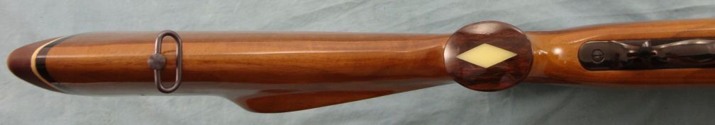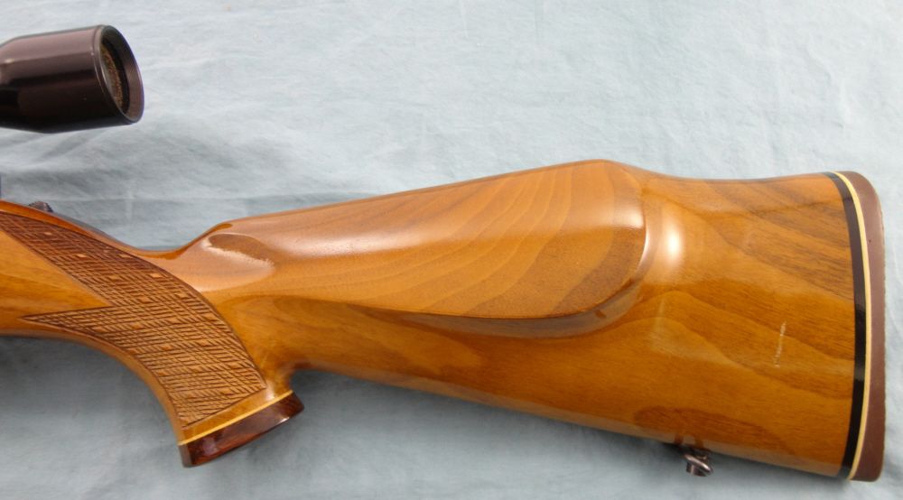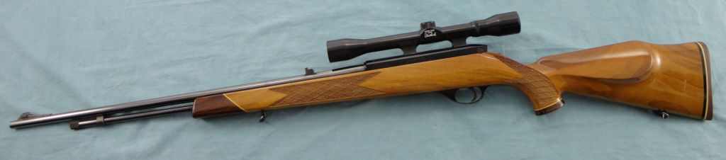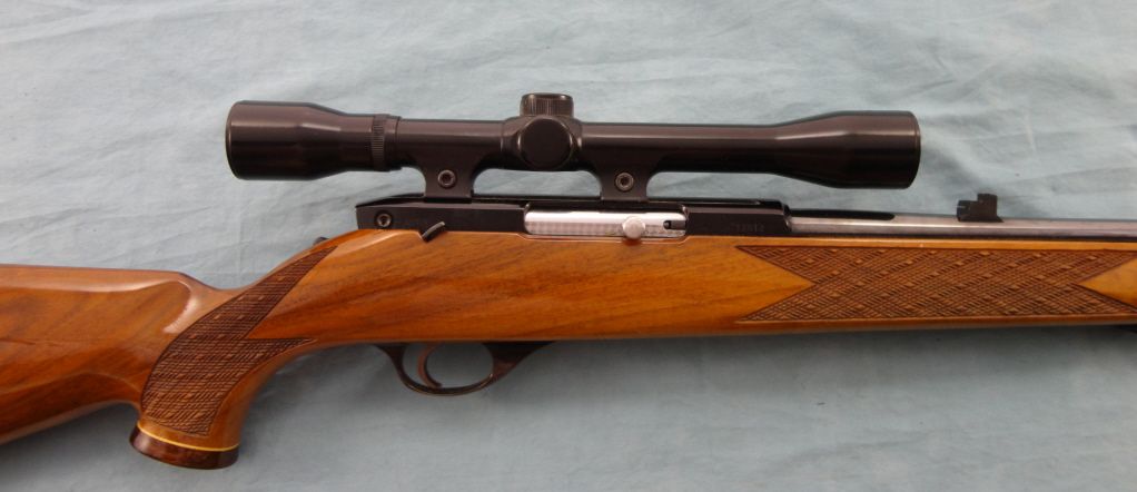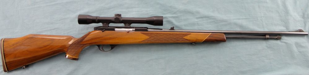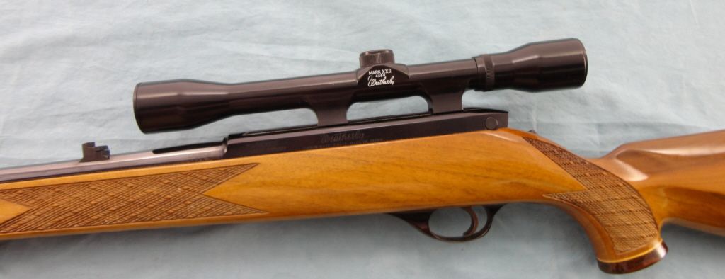 #T12812, 22 cal. Std. Config. w/tube magazine. Fine original blued finish w/matching Weatherby XXII scope. High grade stock w/rosewood fore end & pistol cap. One mark on left side of stock near butt pad. Otherwise gun is as new.