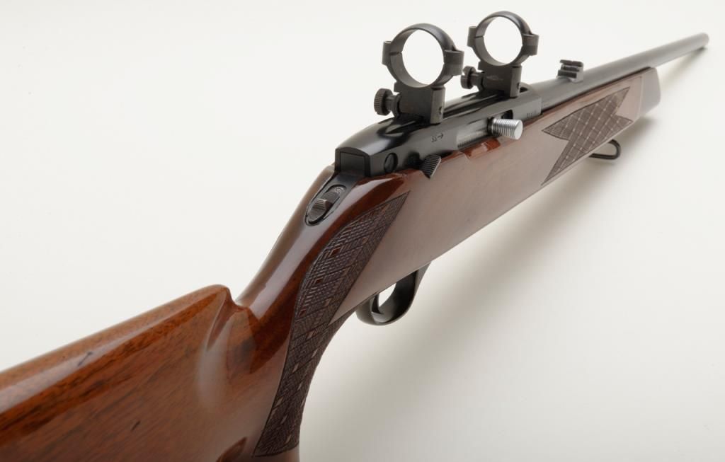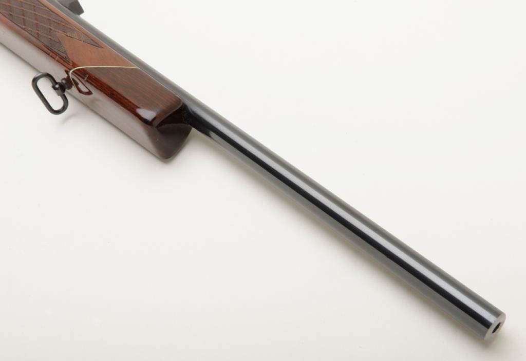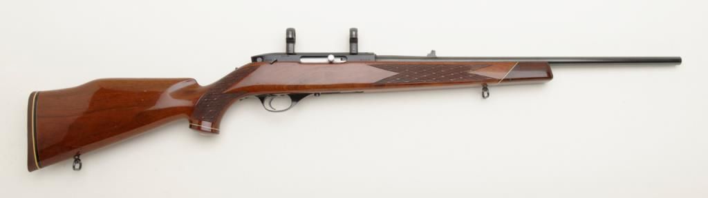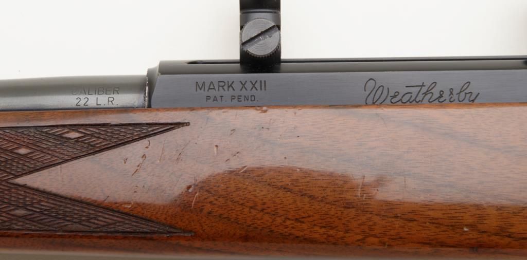 Weatherby Mark XXII, .22 long rifle caliber semiautomatic rifle made in Italy, serial number 21518. The rifle remains in fine to near excellent condition showing some slight use and minor marks in the varnish on the stock. The rifle shows scope rings mounted on the factory rail. Approximately 98% original blue remains. The action is good and the bore is excellent. These Italian made Weatherby’s are early and desirable. No clip. Est.: $300-$600