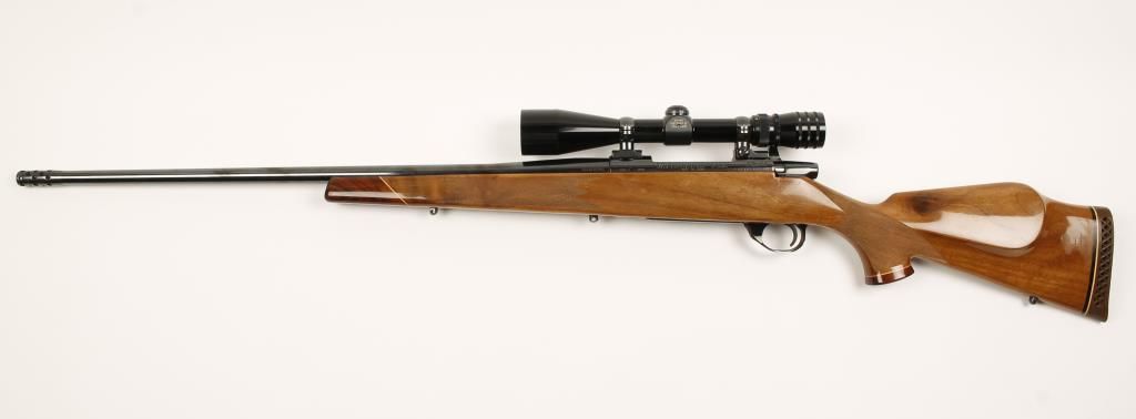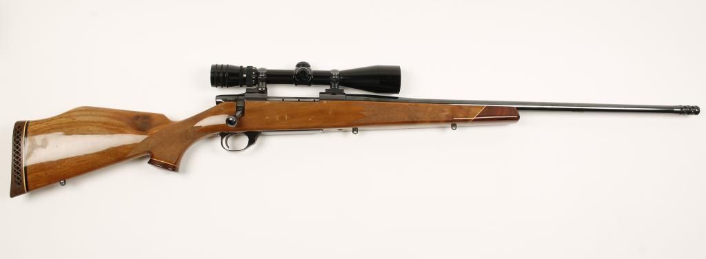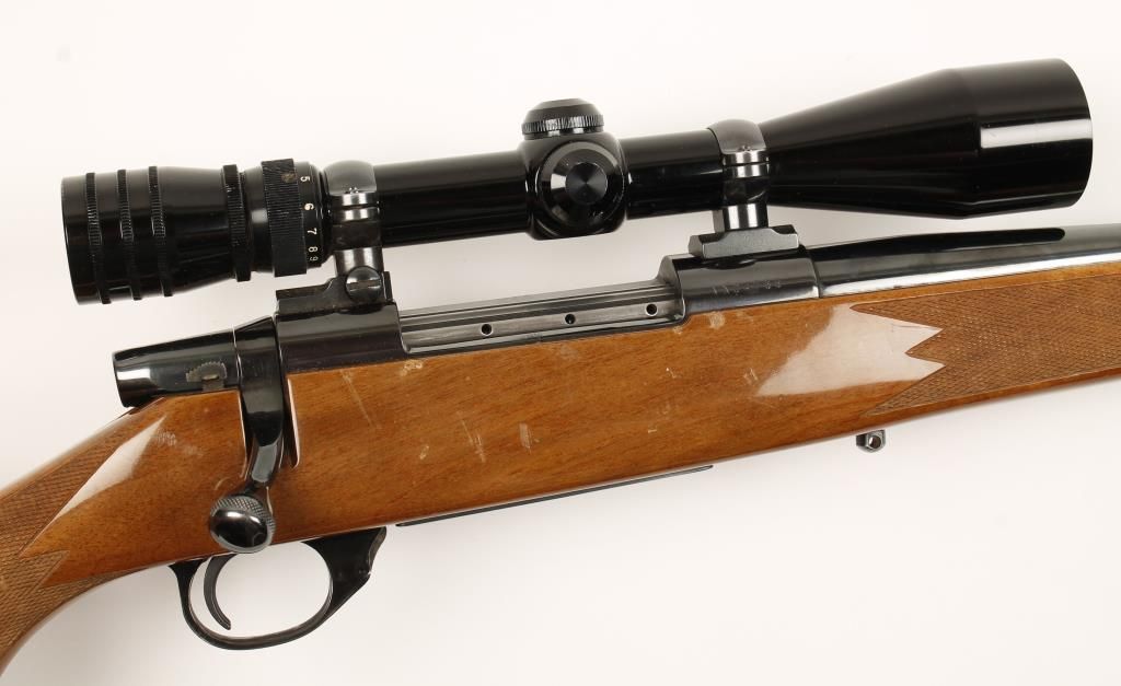 Early production bolt action sporting rifle made in Japan with 24" barrel with added muzzle break. Polished blue finish, checkered Monte Carlo style walnut stock with rosewood forend cap and pistol grip cap, no sights and fitted with Redfield Tracker 3-9X40mm scope. Bore is dirty and action is very good. Condition: Good to very good showing minor scratches and dings in wood.