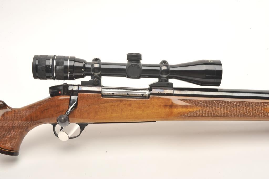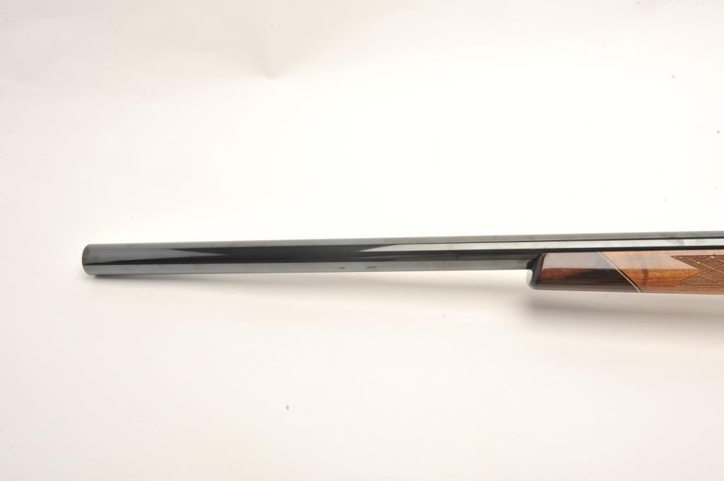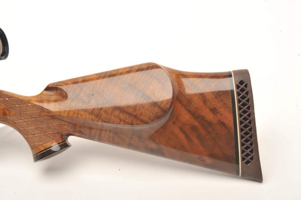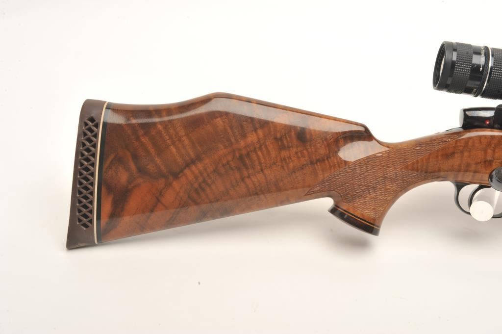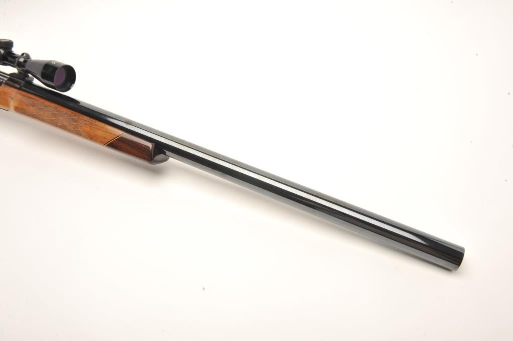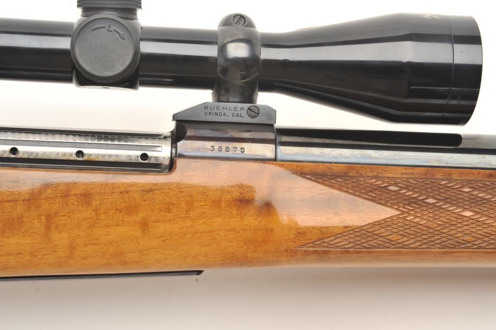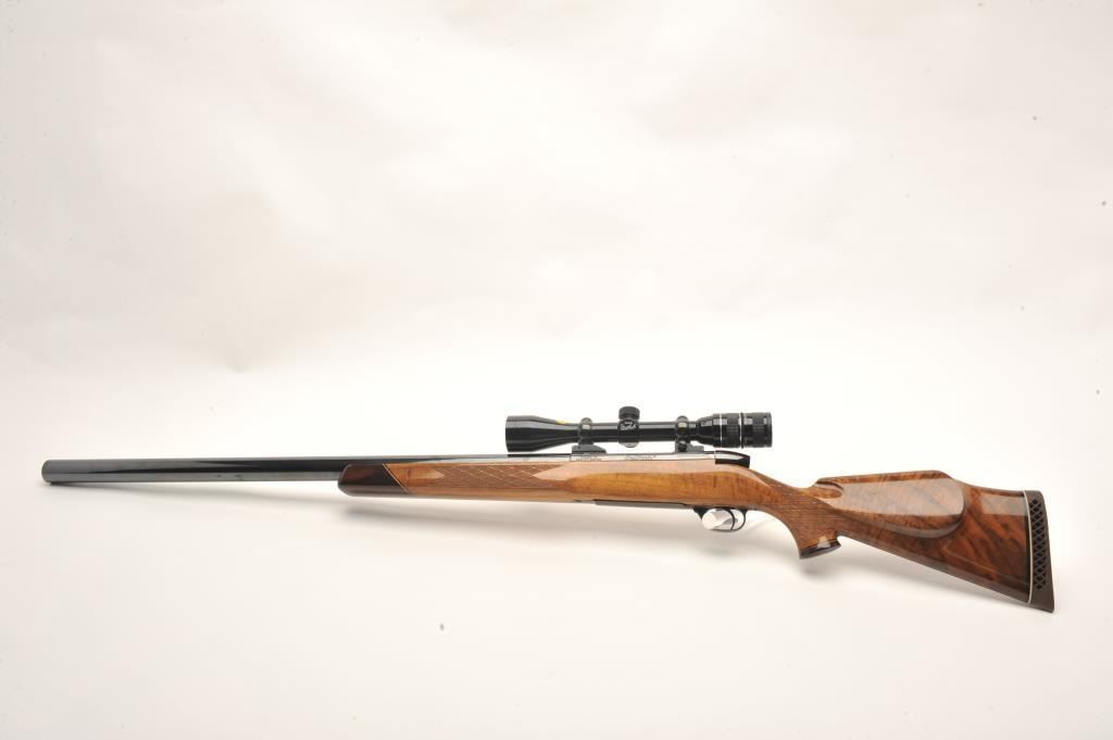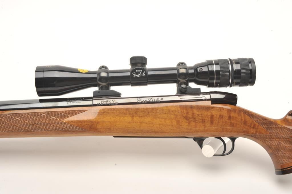 Weatherby Mk.V bolt action rifle, .378 Weatherby Magnum caliber, serial #38675. The rifle is in excellent overall condition with a 29” special order, Weatherby custom shop, extra heavy bull barrel. The barrel andreceiver retain nearly all of their original high polish blued finish with only minor handling marks. The magazine base plate is marked Weatherby Custom while the stock features Rosewood at the fore end and on thepistol grip. The finely checkered wood stock is in very good condition with high grade Walnut showing dramatic feather crotch figure in the butt stock and fine checkering. The butt stock ends with a Weatherby markedventilated rubber recoil pad. The bore is very good, the action crisp and markings are sharp. The rifle is topped with two-piece Buehler scope mounts and a Weatherby Premium 3 x 9 variable power scope. Possibly one ofa kind, this rifle was certainly a special order, custom shop effort given the unique barrel and quality workmanship. (Modern) Est.: $2,000-$4,000.
