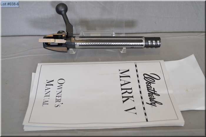 Weatherby Mod Mark V Dangerous Game .340 Wthby Mag cal bolt action Rifle w/ 24" bbl [ appears as new unfired in orig box, blued finish, barrel sights, tapped for scope bases, tan & black composite pistol grip stock w/ decellerator recoil pad ] Ser # PB 033627